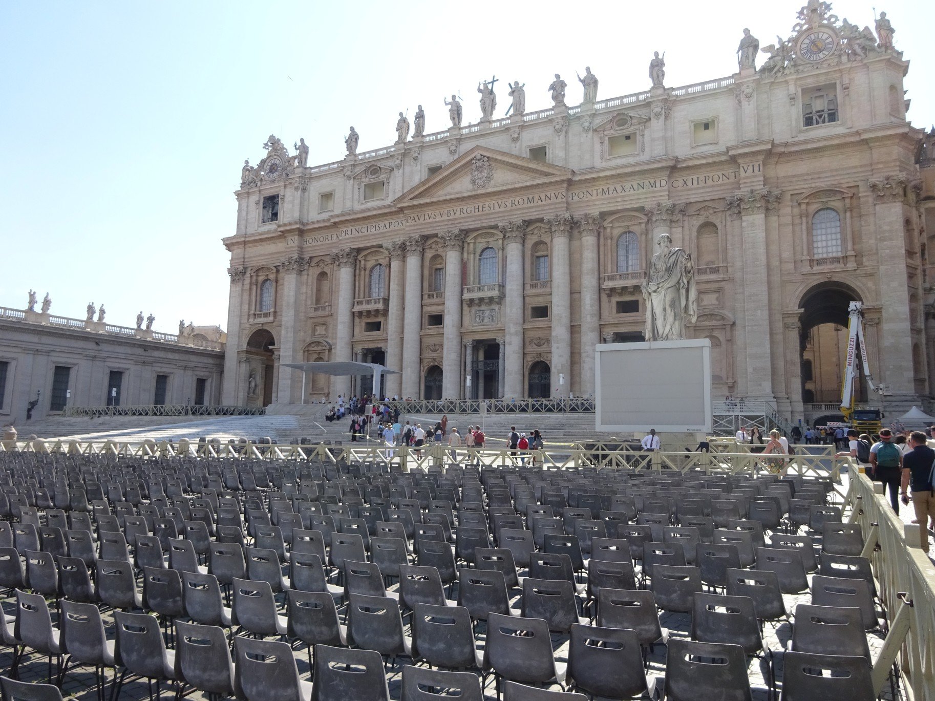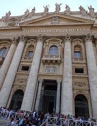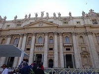 Stoupáme k bazilice po předsazených schodech a nekoukáme se před sebe, nýbrž na fasádu. Hodiny, zvon nebo balustráda se 13 sochami. Zajímavé, ale my hledáme mezi devíti okny a třemi balkony to nejdůležitější místo, lodžii, ze které každý rok papež uděluje své požehnání Urbi et Orbi.