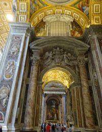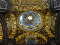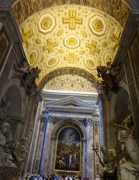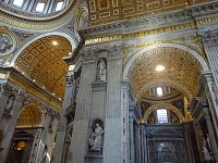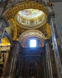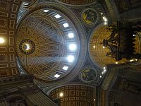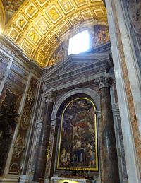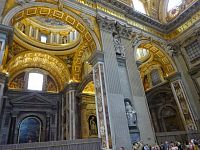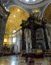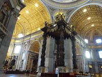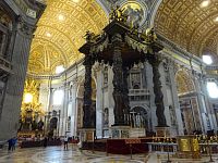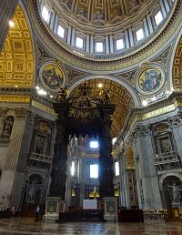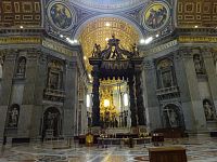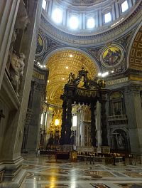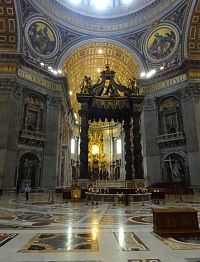 Pokračujeme okolo dalších pomníků či památníků papežů, králů a královen. Zajímavé jsou také oltáře a oltářní obrazy. Přímo pod nádhernou kupoli, jejímž tvůrcem je „pro změnu“ Michelangelo, nás nepustí, a tak si zblízka nemůžeme prohlédnout monumentální baldachýn, který stojí nad hrobem apoštola Petra.