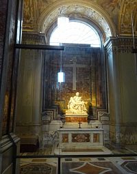 Popsat celý interiér Baziliky svatého Petra by zabralo mnoho stránek, a ještě více času, tak zkusím nastínit to, co nás zaujalo asi nejvíce. Hned napravo od vstupu, v boční lodi lze spatřit kapli, ve které je socha s názvem Pieta z roku 1492. Jedná se o zobrazení Panny Marie s tělem Krista na klíně po jeho snětí z kříže a autorem je slavný sochař, architekt a malíř Michelangelo Buonarroti. V současnosti je socha umístěna za ochranným sklem, jelikož ji v roce 1972 nějaký výtržník poškodil sekerou.