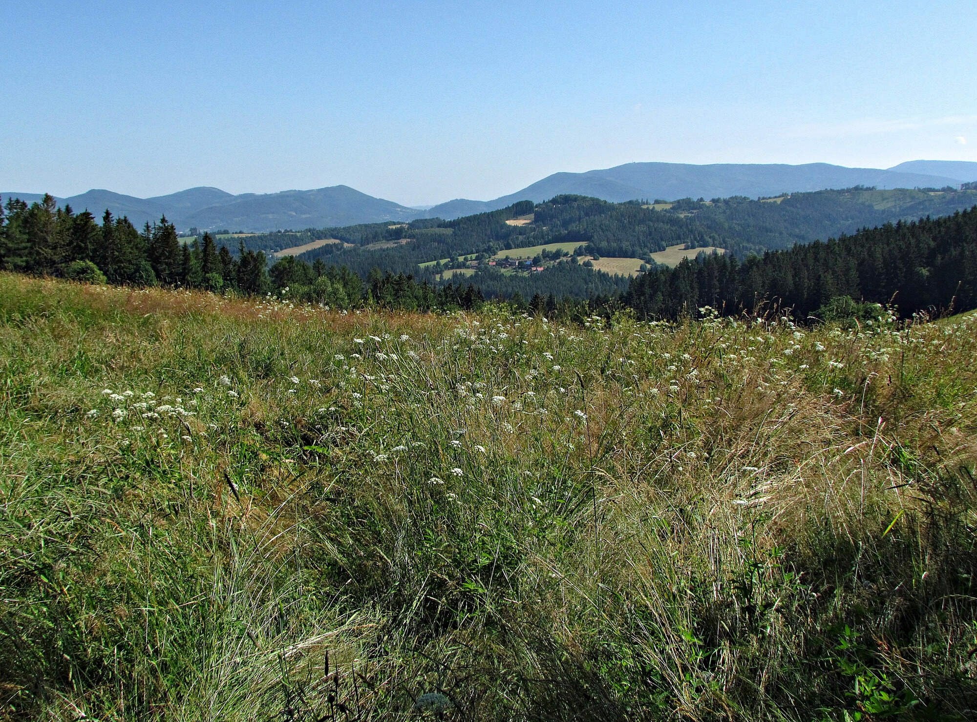 Zleva doprava je vidět – z Veřovických vrchů: Dlouhá (859 m), Kamenárka (862 m), Velký Javorník (918 m) a Kyčera (875 m).