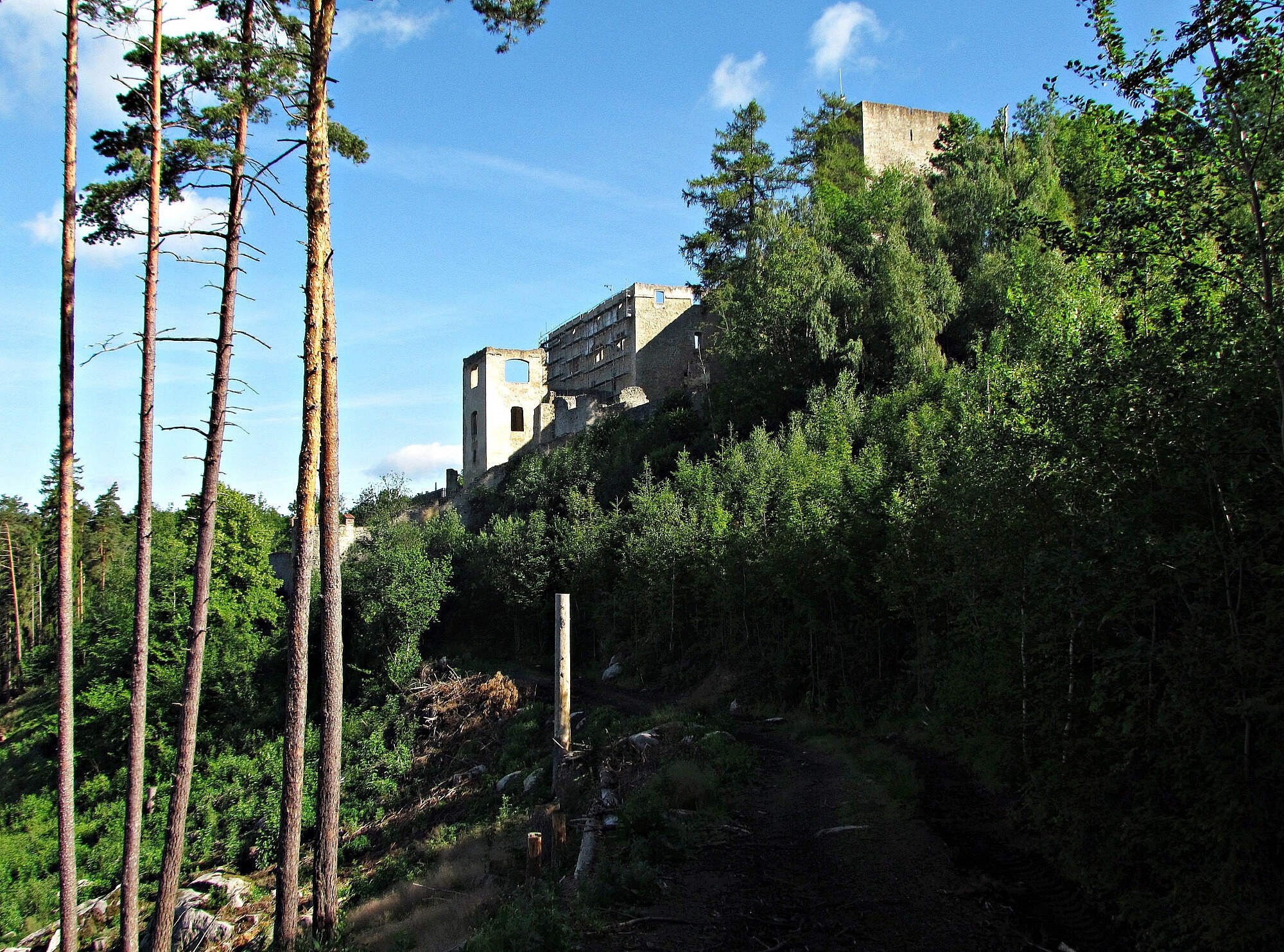 Na dohled od hlavní hradní věže červená tur.trasa ze silničky spojující Staré Město s Landštejnem naposledy odbočí a zamíří po vrstevnici pod vrcholovým úbočím už přímo ke zřícenině. Kousek pod ní pak chodník prochází nad sráznou novodobou pasekou. Sice se odtud otvírá velmi pěkný výhled na velkou část osady Pomezí, ale starobylý chrám sv.Jana Křtitele a pozůstatky hradu zvaného Merkl z tohoto místa vidět nejsou. I tak je ale výhledové panoráma zahrnující rybníčky, chalupy a stavení osady Pomezí, jakož i protější zalesněný bezejmenný vrch (650 m) a západní frontu hradebních objektů, zajímavé.