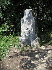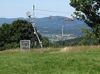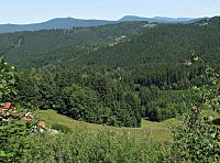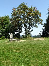 Odtud jsem pod velkým jeřábem popošel ke kamennému pomníku s reliéfem dvou kraviček sklánějících se k napajedlu a kochal se od horního konce velké louky pohledy směrem k východu, jihu a západu. Tady za vrcholem se nachází horní konec lanovky boční sjezdovky, končící u umělé vodní nádrže ve Skiareálu Soláň. Za lanovkou byla hluboko v údolí vidět část osídlení obce Hutisko-Solanec. Pode mnou pod loukou procházela silnička k Čartáku a nejbližší obzor všude kolem byl tvořen vrchy hlavního hřebene „Vsackých Beskyd“ a bočních hřebínků spadajících dolů ke Vsetínské Bečvě. Protilehlý horizont pak vyplňovala dlouhá hradba hlavního hřebene Javorníků.
