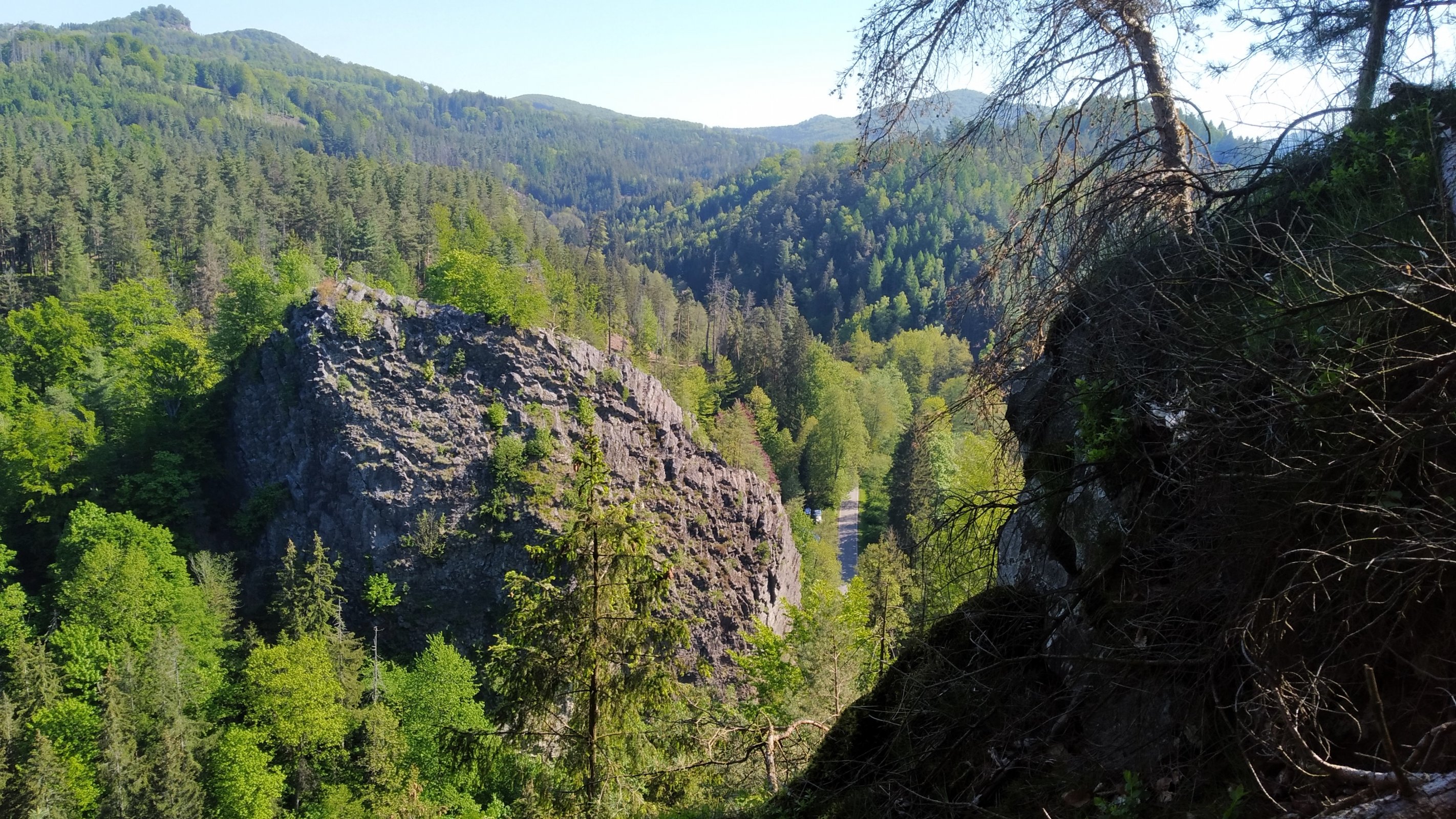 Strmý znělcový skalní Ostroh (504 m) v kaňonovitém údolí řeky Kamenice. Při stavbě silnice a železnice tu byla odlámáním skály odhalena vnitřní struktura tohoto vulkanického suku s té…