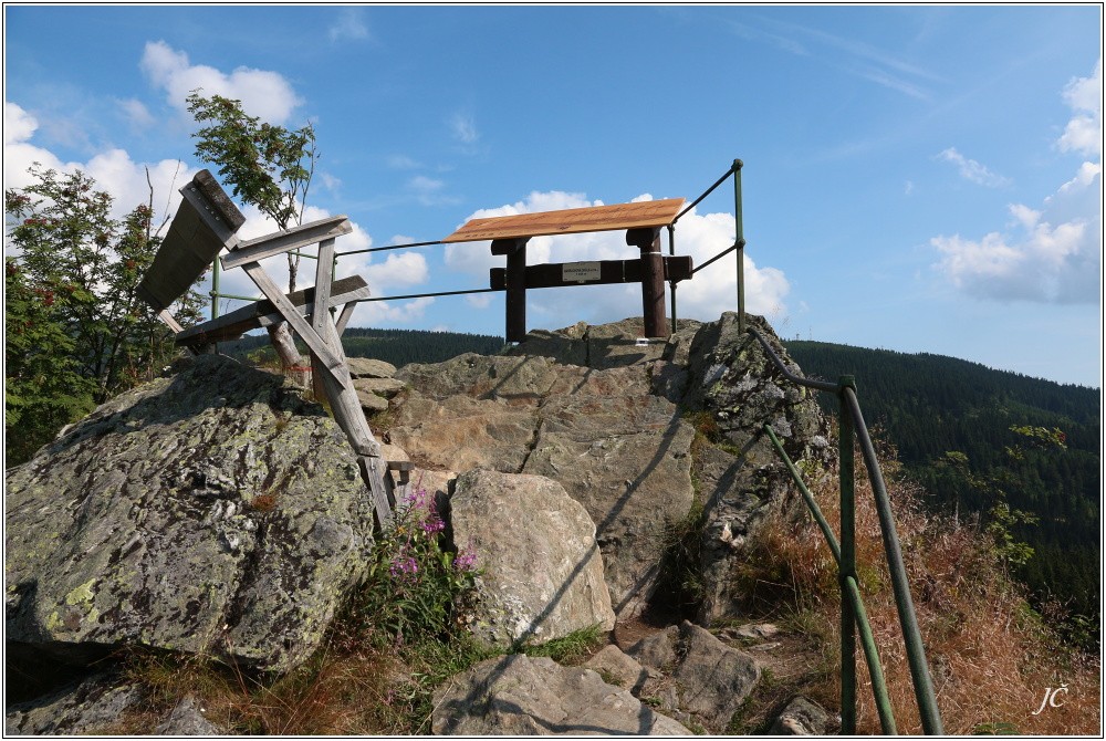 Na úbočí hory Mechovinec najdeme v nadmořské výšce 1035 m zajímavou osamocenou svorovou skálu (tor), ze které je krásný výhled na Špindlerův Mlýn, Zlaté Návrší, Medvědín, Železnou horu, Kozí hřebety, Stoh, …, zkrátka na pěkný kus Krkonoš. Není divu, že už v roce 1893 zde Klub českých turistů zbudoval vyhlídku, nazvanou po hraběti Harrachovi. Na skále je zábradlí, reliéf ukazující, co vidíte a zajímavá lavička, která sice nebudí zrovna důvěru, ale sedí se na ní dobře. K vyhlídce vede významová značka z červeně značené tzv. Bucharovy stezky, první značené cesty v tomto kraji.