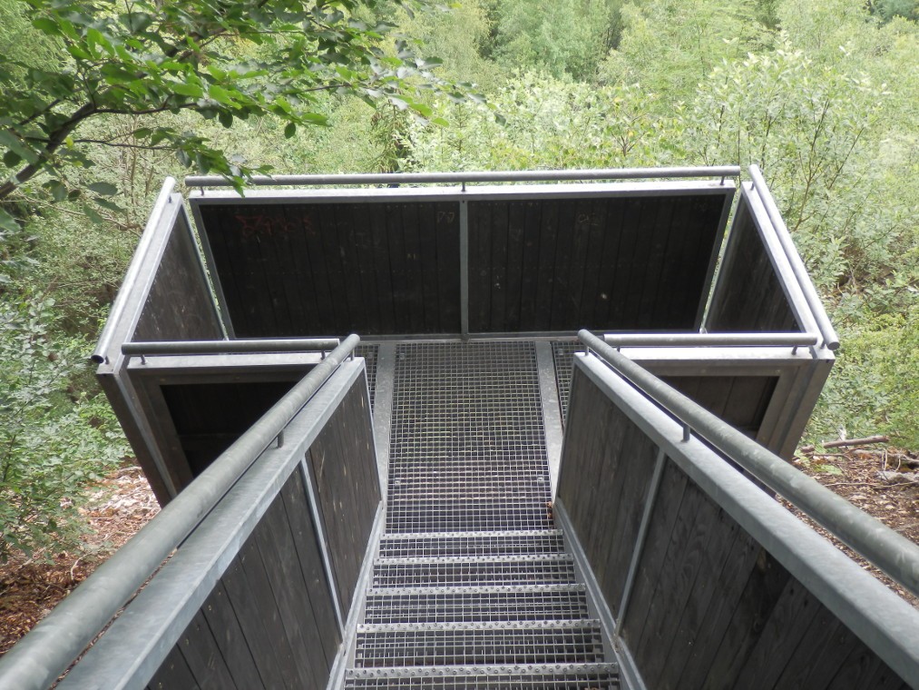 Po přibližně 200 metrech stanete u ocelového schodiště, po kterém nebudete stoupat, ale sestupovat! Vyhlídka se totiž nachází o 124 schodů níže. Přímé schodiště se skládá z několika ramen zakotvených do opukového skalního srázu. Na schodiště a plošinu může vstoupit v součtu maximálně osm osob (nejvyšší přípustná hmotnost je 1.500 kg). Rovněž není dovoleno rozkmitávat konstrukce schodiště a vlastní vyhlídkové plošiny.
