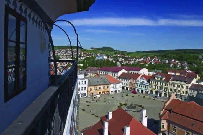 Pohled na město Pelhřimov z ptačí perspektivy. Jeden z nejkrásnějších výhledů na město Pelhřimov i okolní krajinu je z ochozu vyhlídkové věže kostela svatého Bartoloměje. Do výšky třiceti metrů vystoupáte po 148 schodech kolem pelhřimovských zvonů a před vstoupením na ochoz můžete zklidnit dech v komůrce hlásného s historickými fotografiemi města Pelhřimova. Výstup na věž můžete zdolat i s plyšovými kozami - rekordmankami Rózou a Rézou, které byly návštěvníky věže vyneseny již do výšky nad 128 000 m n.m. Proč s kozami na věž? Před mnoha lety opravdu hlásný na věži kozy choval, a protože kozám se po schodech moc nechtělo, musel je vždy hlásný vzít a z pastvy domů na věž vynést.