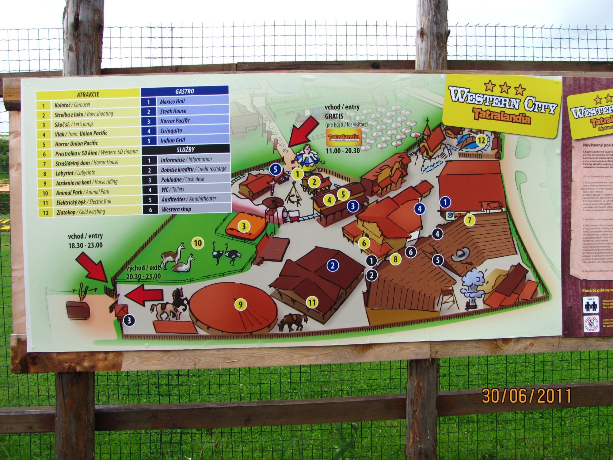 Nachází se zde saloony, letní kino, jezdí vláček, stojí zde i kostelík, stáje s koňmi, indiánská osada s totemem, obchody atd. Za atrakce se platí, o prázdninách jsou teď tři zdarma.