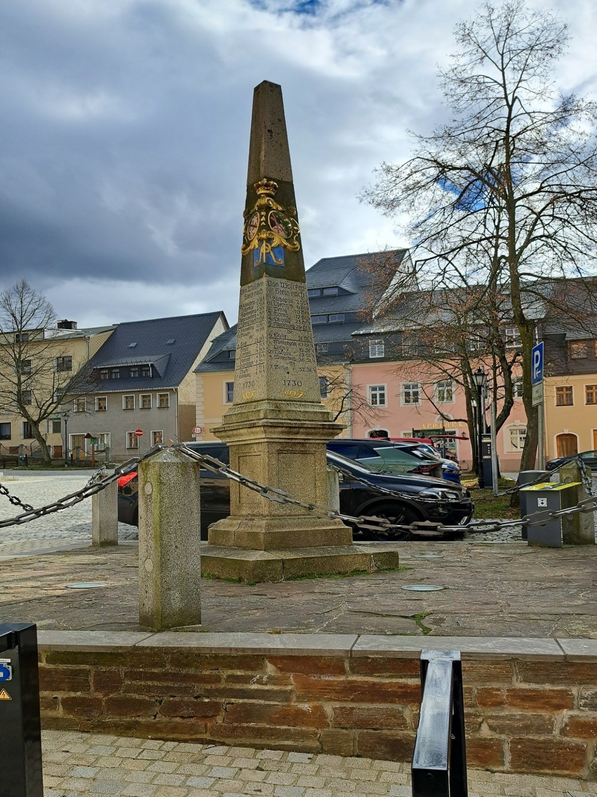 Tento obelisk jsem objevil severozápadně od centra lázní Thermalbad Wiesenbad v ohybu náhonu řeky Zschopau. Z lázeňské cesty k němu vede pěšina v místech, kde se nachází na zdejší naučné stezce zastavení číslo 9 s…