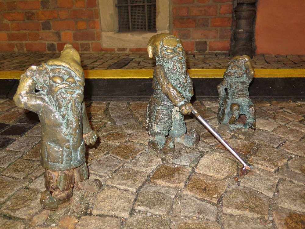 Tito tři trpaslíci, kterým se občas říká také postižení nebo neúplní, patří mezi nejstarší figurky tohoto typu ve Vratislavi. Invalidní „krasnoludki“ jsou považováni za ambasadory kampaně „Wroclav bez bariér“. Tři postavičky před radniční budovou prý symbolizují hledání architektonických překážek, které jim ztěžují život a snaží se změnit pohled „běžných“ lidí na osoby se zdravotním postižením.