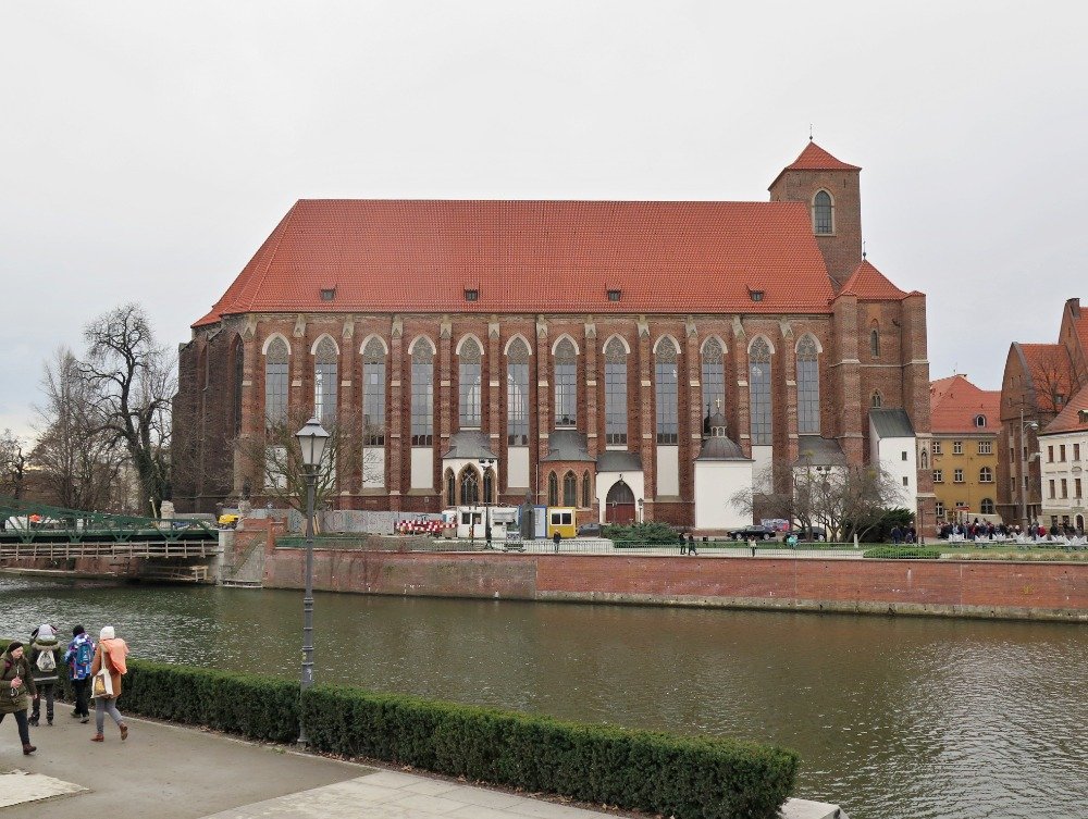 Původně klášterní, z cihel a pískovce postavený, kostel je 78 metrů dlouhý, 25 m široký a 41 m vysoký (vnitřní výška lodě je ale „jen“ necelých 24 m) a nemá transept. Přesto, že se jedná o stavbu gotickou, touto epochou jeho stavební vývoj zdaleka neskončil. Například kaple sv. Kříže byla dokončena v roce 1666, takže se jedná o nejstarší barokní stavbu ve Wroclawi, a ze 17. století pochází také Panna Marie Vítězná z Marijampolé. Mnozí návštěvníci tohoto svatostánku zde obdivují hlavně okenní vitráže, ale ty přitom pocházejí z období poválečné přestavby.