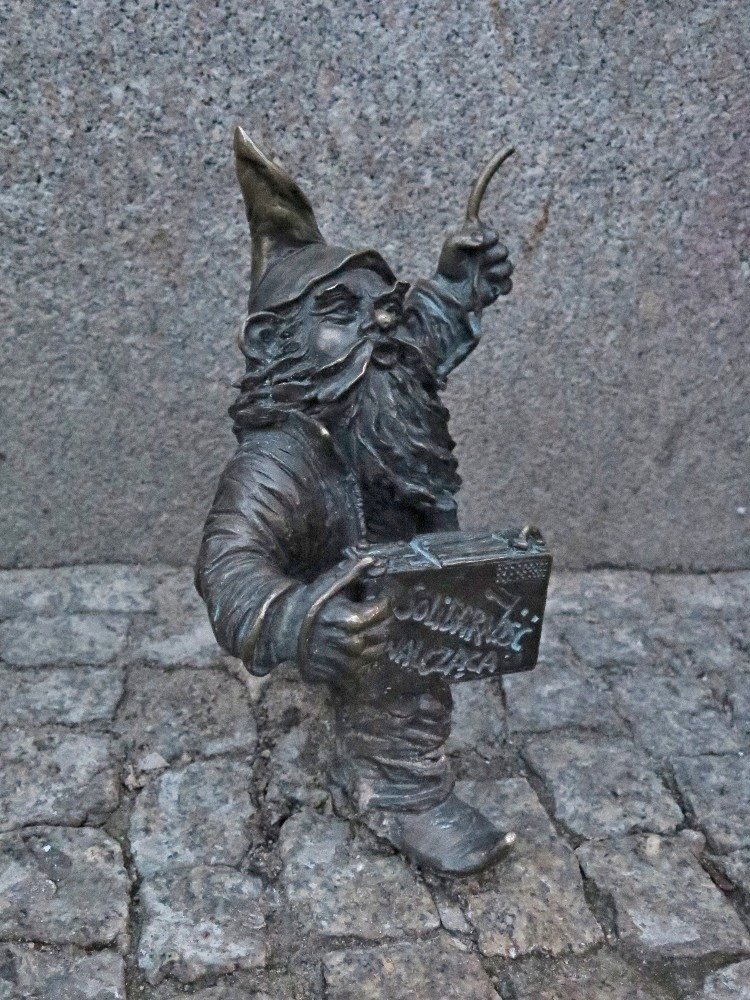 Slavní wroclawští trpaslíci se dají rozdělit do několika skupin. Často sice fungují hlavně jako reklamní poutače, ale nezanedbatelnou skupinu těchto lidiček tvoří skřítci, kteří mají upozorňovat na významné kapitoly novodobých dějin Polska. Opomenuta – samozřejmě – nemohla být ani Solidarita, tedy hnutí, které se v 80. letech minulého století postavilo na odpor vládnoucím komunistům a mělo velkou zásluhu na pozdějších změnách ve střední a východní Evropě.