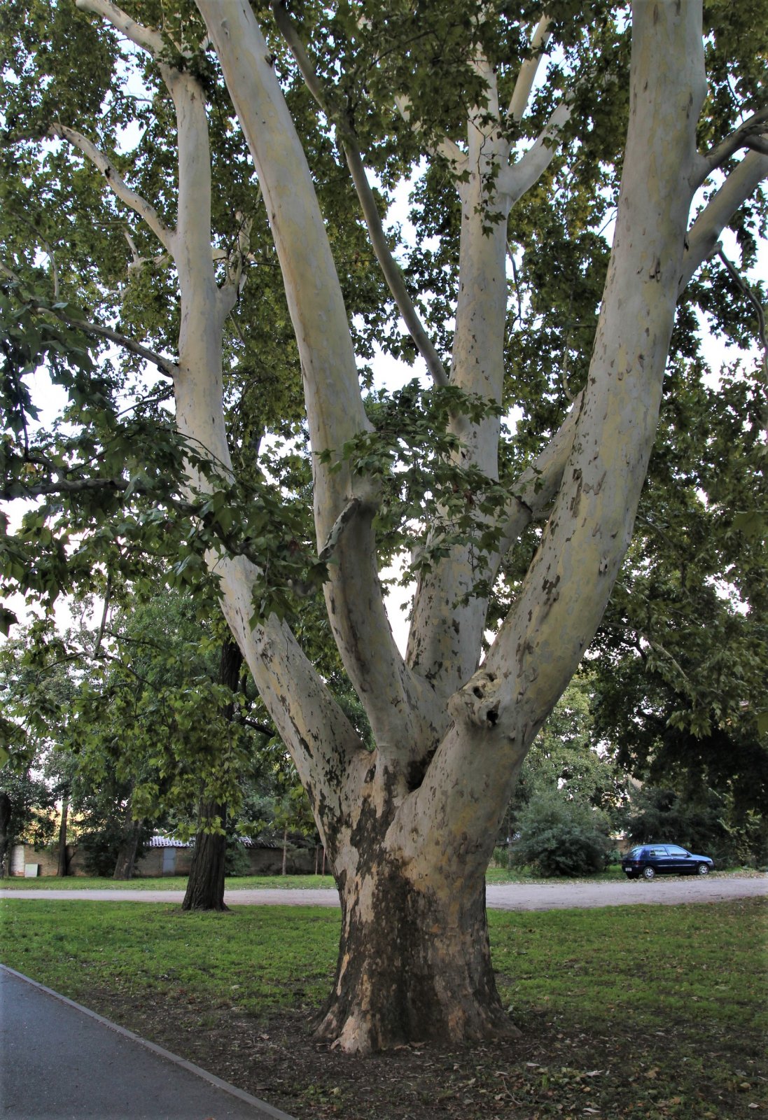 Tento dominantní platan, který v zápoji okolních stromů se dere do výše 23 m a vytváří tak mohutnou kapkovitou korunu. Kmen stromu v prsní výšce dosahuje 505 cm a ve dvou metrech nad zemí se větví na na čtyři dílčí kmeny. Jeho věk se odhaduje na 150 let.
