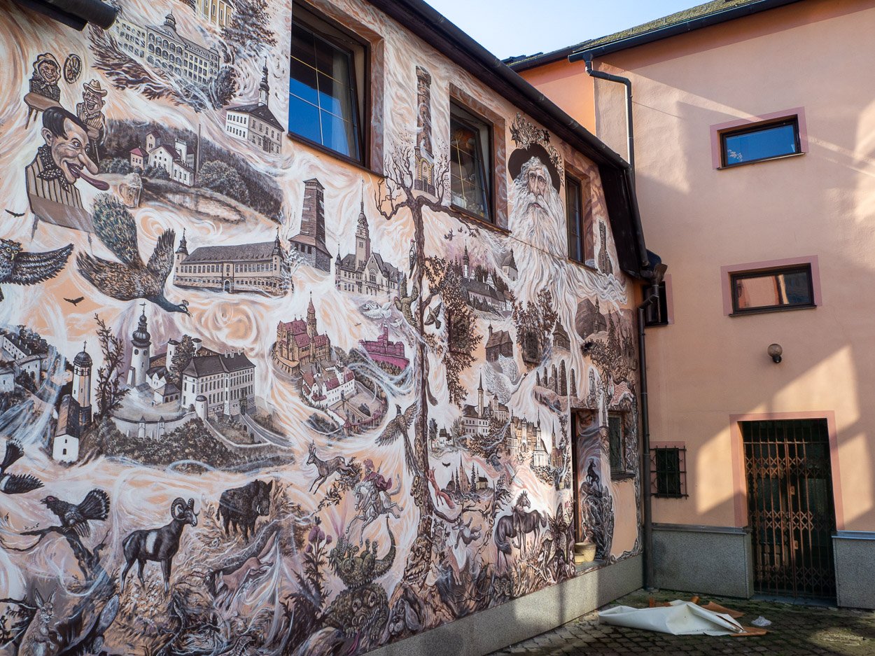 No a proč tu ta malba vznikla? Na dvorku bylo kdysi posezení zahradní restaurace. Restaurace není, malba zůstala.