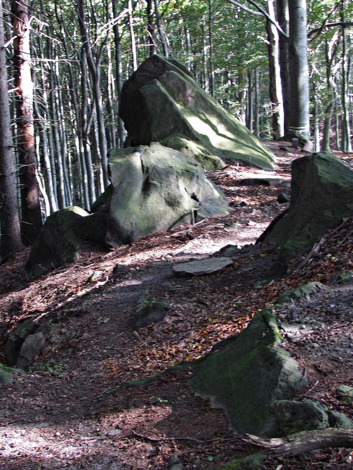 Chodníček nás od něj vede stále východním směrem a po dalších sto metrech staneme před posledním sukem, jehož ozdobou jsou dvě daleko zajímavější a jen o trochu nižší skály. Ta druhá má při pohledu zdola dosti bizarní podobu - v její stěně je totiž k vidění „ksicht“ jakési do kamene zakleté hororové příšery – a přiznám se, že i když jsem už velký kluk, sám bych pod ní spát v lese pod širákem nechtěl. Protože… co kdyby, že ano?