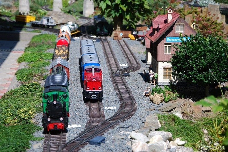 Soukromý model železnice na zahradě rodinného domu ve Střížově u Drahanovic. Po kolejích tu jezdí několik modelů vlaku v prostředí umělé krajiny s mosty a jezírky.