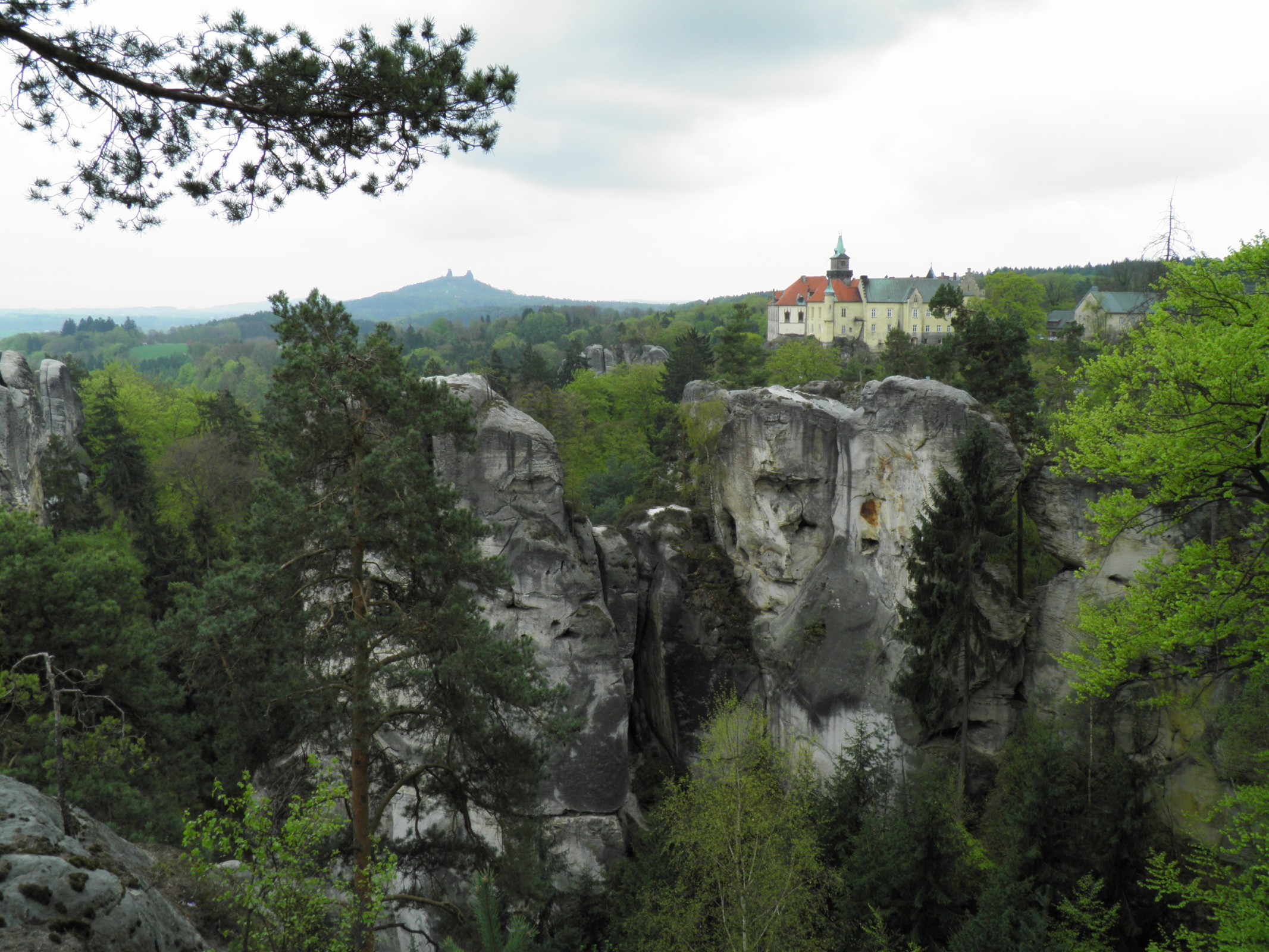 Auto jsme nechali na placeném parkovišti u zámku, který nahradil původní hrad Skály ze 14.století a šli dovnitř. Vstoupili jsme přes kamenný most, který překlenuje hlubokou skalní průrvu, nahrazující příkop. Ocitli jsme se v pseudogotickém předhradí s byty a konírnami a v průjezdu jsme našli recepci hotelu, kde jsme získali tři razítka do památníku.