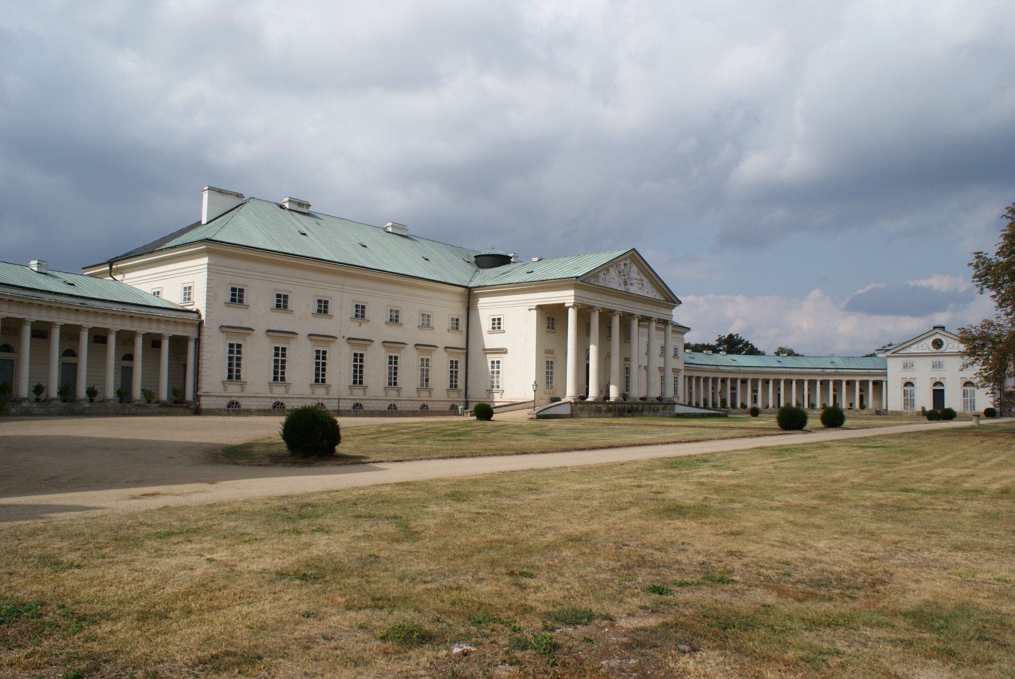 Velkolepý zámek je postaven na půdorysu otevřené podkovy. Na dvoupodlažní střední část s klasickým šestisloupovým portikem s tympanonem navazuje na obou stranách přízemní obytná oblouková stavba se sloupovým Ochozem. Jednu stranu pak zakončuje patrová budova knihovny, druhou obdobná budova divadla. Ve střední části se nachází kruhová, bývalá, kaple s lucernou a velký taneční sál. Celá stavba měří neuvěřitelných 227 metrů.