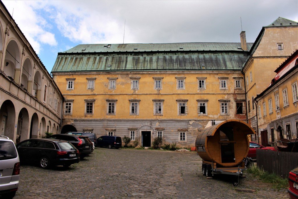 Areál zámku se nachází v jižní části starého města. U jeho zrodu stál Prokop z Vartenberka a stavba zámku byla dokončena mezi roky 1541 – 1543 v renesančním slohu. V roce 1614 zámek kupuje Radslav Vchynský ze Vchynic. Kdy se změnil název na rod Kinských je tak trochu záhadou. Víme ale jistě, že zámek rod vlastnil až do roku 1945. V tomto roce byl zámek na základě Benešových dekretů zkonfiskován a o něco později byly v zámku kanceláře lesní správy a byty jejich zaměstnanců. Dnes je zámek v soukromém vlastnictví a je postupně opravován. Co se týče stavebního slohu, který dnes v areálu převažuje, lze jmenovat klasicismus. Příčinou změny byla rozsáhlá přestavba mezi lety 1847 až 1849. Tehdy se nejen stavělo, ale také bouralo. Na zámecké nádvoří se vchází bránou z Lipové ulice. Nádvoří je nepravidelné. Na západní straně je největší patrová budova zámku. Na straně jižní jsou v budově arkády. Na protější straně je klasicistní dům. Část zámku má být přístupná, ale během naší návštěvy bylo zavřeno. Zámek má i bránu na západní straně. Zajímavá stavba za zhlédnutí jistě stojí.
