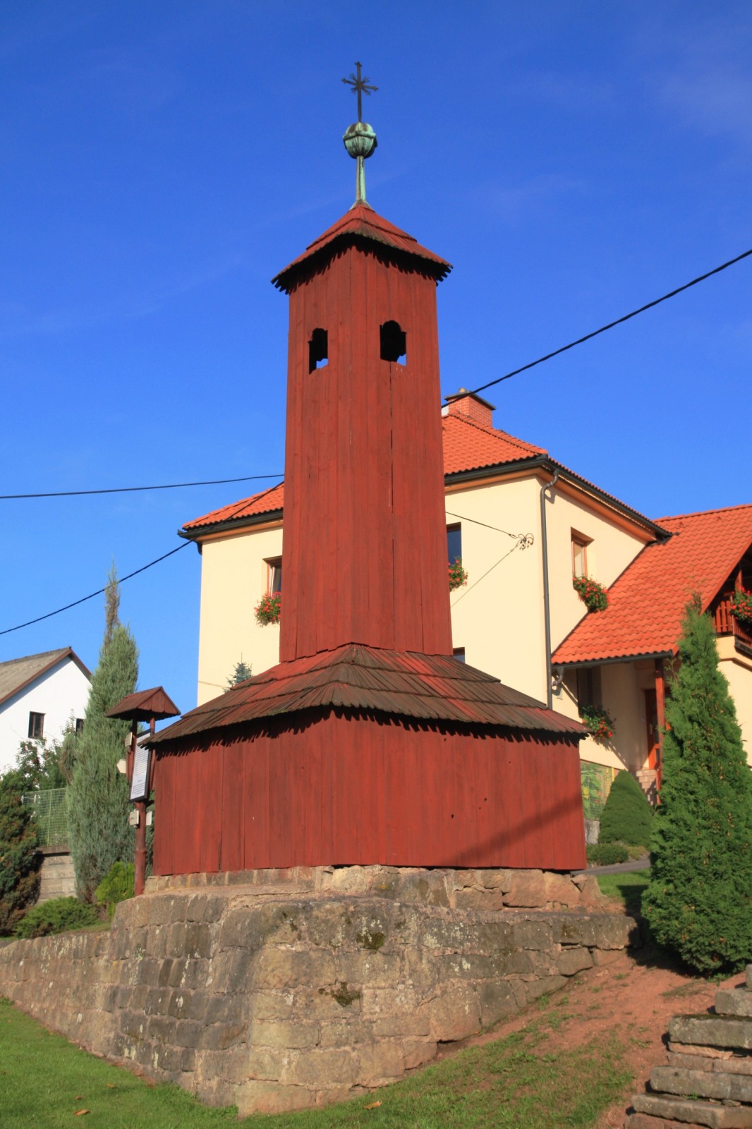 Dřevěná zvonička je dominantou původní dřevěné architektury v centru obce. Je v pořadí třetí zvoničkou, která byla v obci postavena. Jako první se uvádí menší dřevěná zvonička, která byla v roce 1882 skácena větrem. V letech 1884-86 byla postavena zvonička nová. Světil ji páter Bartoš z Písečné v roce 1887. V letech 1894 až 1895 na náklad hraběnky Anny z Lützowa byla zvonička přemístěna ke statuli u silnice. Po rekonstrukci v roce 1920 nákladem velkostatku opravena a novými prkny a šindelem pobita. Po dokončení však byla neznámým pachatelem 6. července 1920 zapálena a vyhořela. V roce 1929 proto byla postavena nynější třetí zvonička. Obecní kříž u zvoničky je nejstarším křížem v Žampachu. Byl pravděpodobně postavem jezuity v roce 1693 a nese stejný letopočet s nedalekým pranýřem. Obnoven byl v pak roce 1891.
