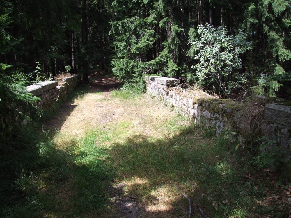 Když však člověk vytrvá a ujde od chvíle, kdy opustil silnici, jeden kilometr, otevře se před ním nečekaně nádherný pohled na zajímavou stavbu. Mohutný kamenný most se klene nad železniční tratí č. 142 vedoucí z Karlových Varů do Potůčků nebo až do Německa (Johanngeorgenstadt). Železnice tady na 29,5 kilometru své tratě v nadmořské výšce 798 metrů prochází náročným terénem, kvůli kterému musel být vyhlouben ve skále zářez v délce několika desítek metrů pro její vybudování. Kdekdo si může klást otázku, proč takový masivní most na lesní cestě? Ještě před vybudováním železniční tratě tudy vedla důležitá obchodní cesta, i když to tak dnes nevypadá. Tudíž i šířka mostu musela odpovídat tomu, že po něm nebudou chodit pouze lidé, nýbrž jezdit také povozy.