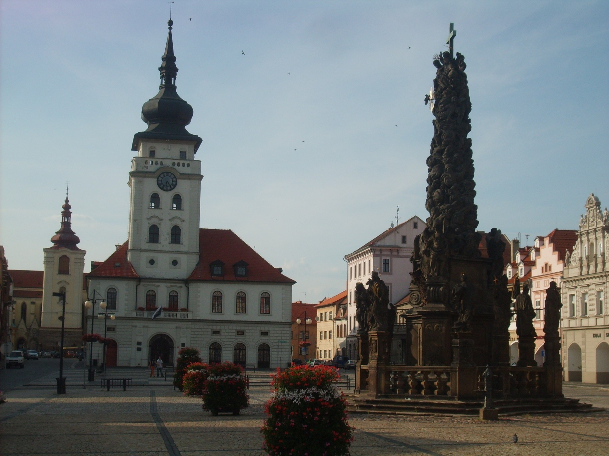 Epidámia moru trápila naše národy v stredoveku. Mesto Žatec postihla v roku 1582. Tento stĺp postavili v rokoch 1707 - 1713 z príspevku lekárnika Candela. Vytvoril ho František Tolinger z Litoměřic. Roku 1753 stĺp doplnil žatecký sochár Jan Karel Vetter. Socha Najsvätejšej trojice sa nachádza pod medeným krížom. Okolo stĺpa sú sochy :