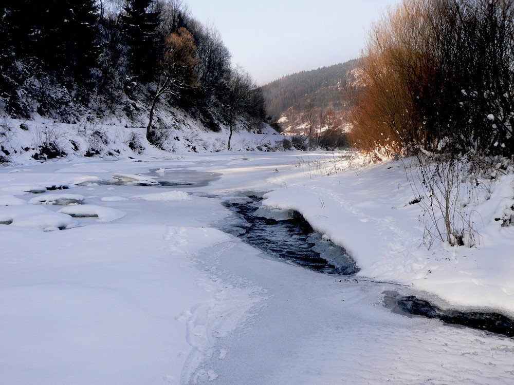Zborov nad Bystricou - Řeka Bystrica z mostu U Droščákov, vzadu Šlapkov vrch autor: krtek2