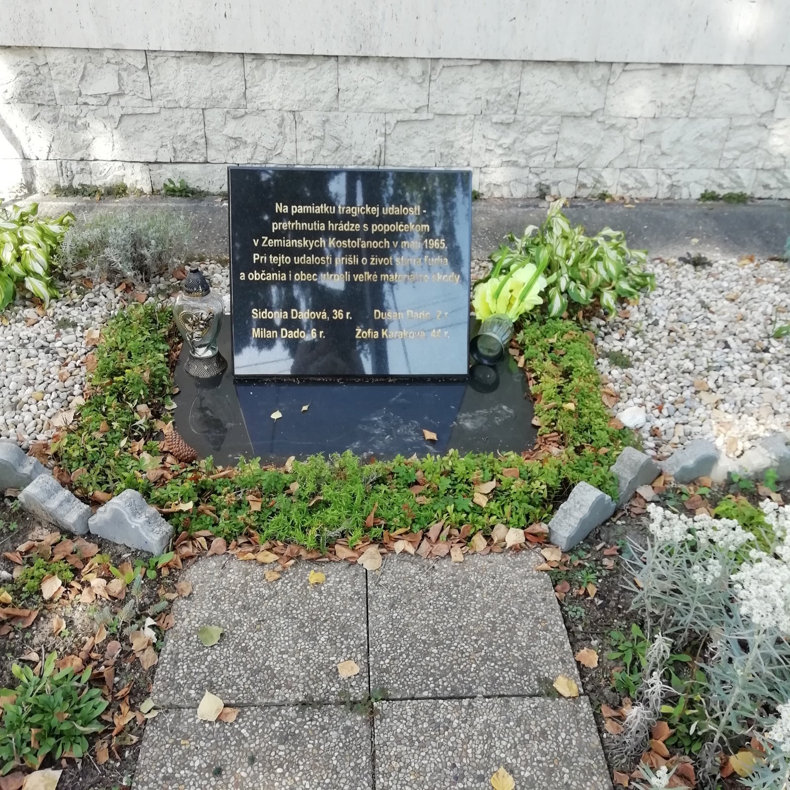 K pamiatke, k jednej z najsmutnejších udalosti, obec v roku 2015 odhalila pamätnú tabuľu, počas ktorej odhalenia sa mnohí občania nezdržali sĺz. Na doske z čierneho mramoru sa píše -"Na pamiatku tragickej udalosti - pretrhnutia hrádze s popolčekom v Zemianskych Kostoľanoch v máji 1965. Pri tejto udalosti prišli o život štyria ľudia a občania utrpeli veľké materiálne škody. Sidonia Dadová, 36 r., Milan Dado, 6 r., Dušan Dado, 2 r., Žofia Karaková, 44 r."