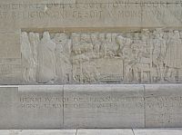 Po obou stranách ústředních postav jsou zobrazeny postavy velkých osobností protestantské víry. A protože se jedná o památník mezinárodní, je zde připomínán vliv kalvinismu v různých zemích: a vidět tak můžeme - nalevo od centrální skupiny - admirála de Coligny za Francii, Viléma Mlčenlivého za Nizozemsko a Fridricha Viléma Braniborského, ochránce hugenotských uprchlíků, za Německo. Vpravo se nachází Roger Williams za Novou Anglii, Oliver Cromwell za Velkou Británii a Stephen Bocskay za Uhry. Koncové stély pak připomínají Martina Luthera, duchovního otce protestantismu, a Ulricha Zwingliho, jednoho z mužů, kteří konvertovali část Švýcarska na novou víru. Alespoň vytesaným jménem je na zdi zmíněn také náš Jan Hus.
