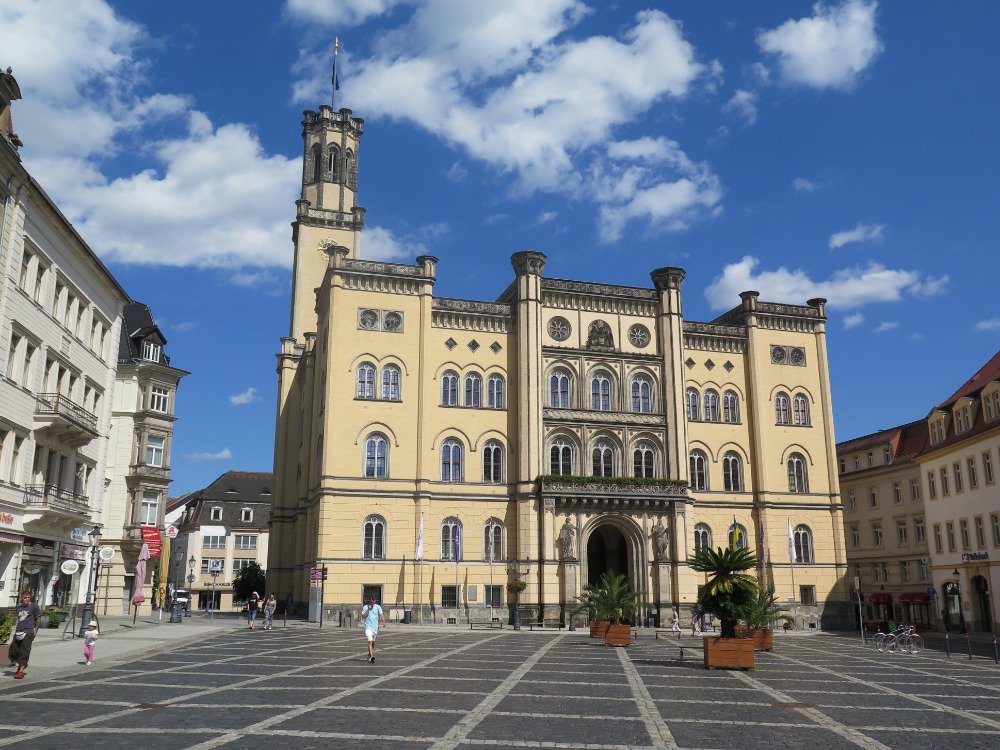 Čtyřkřídlá radnice s vnitřním nádvořím stojí na místě starší budovy zničené v roce 1757. Z ní pochází současná – asi 50 metrů vysoká - radniční věž, která však byla stavebně přizpůsobená nové budově. Radnice byla v letech 1990 až 2002 kompletně zrekonstruována, což se týká i interiérů v čele s bohatě zdobeným velkým jednacím (tzv. občanským) sálem s nádherným dřevěným kazetovým stropem z roku 1891 (zde byly restaurační práce dokončeny v roce 1993). Krásné interiérové okenní vitráže pocházejí z roku 1893 a vytvořila je dílna Türcke a Schlein.