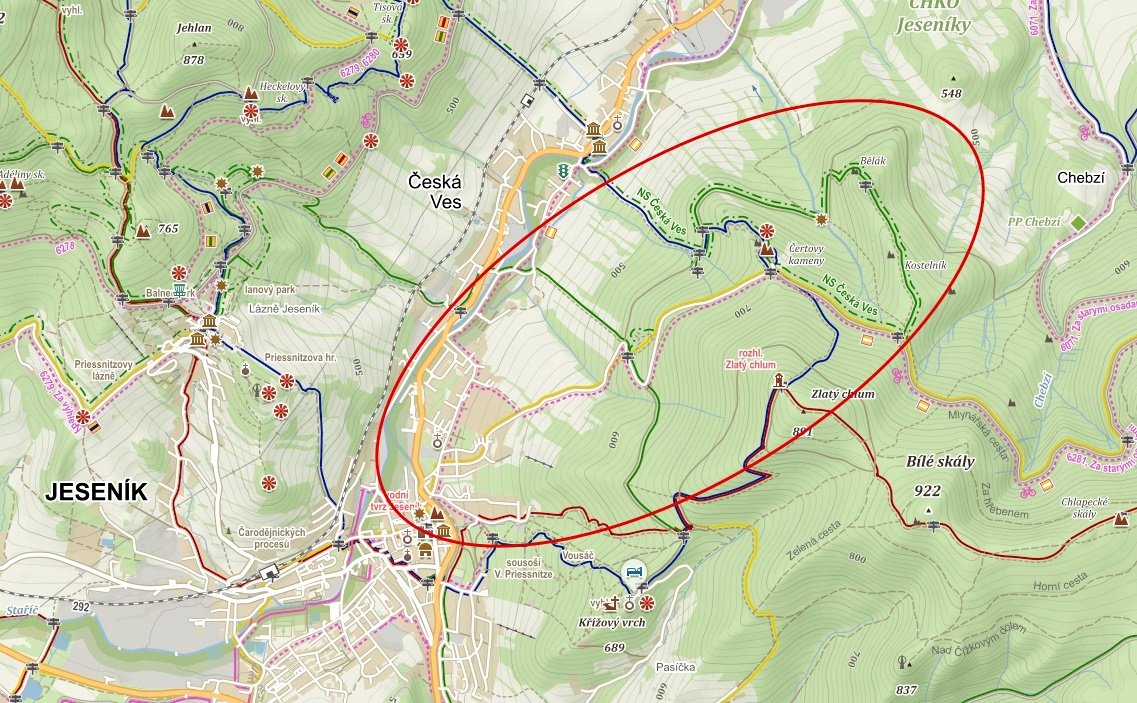 Zlatohorská vrchovina: mapa trasy Bělák - Čertovy kameny detail (zdroj: mapy.cz)  autor: alexandra66