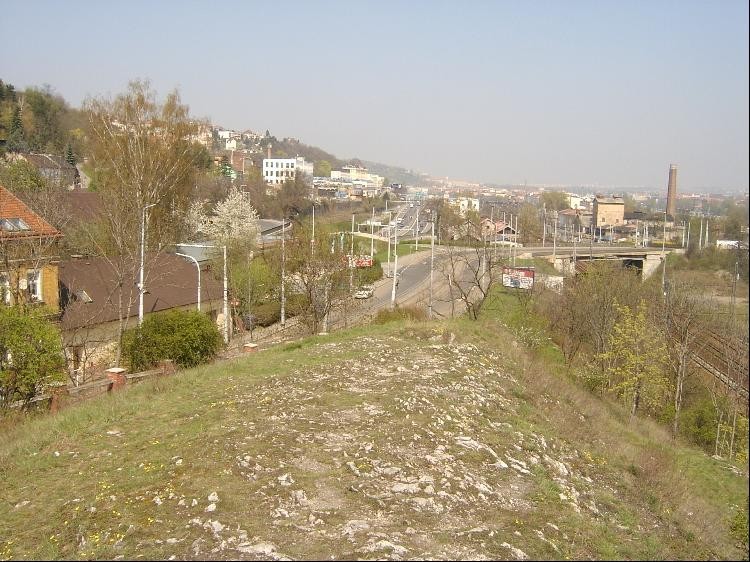 Pohled od kostela na Zlíchov: Farní kostel sv. Filipa a Jakuba tyčí se malebně uprostřed zrušeného hřbitova, na vápencové skále, oddělené od ostatních skal hlubokým zářezem silnice, zřízené již roku 1742.