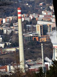 Čtenáře v jejich rychlém a bystrém úsudku nejspíš zklamu: není jí notoricky známá budova č.21, ale nedaleko od ní v areálu továrny stojící štíhlý komín. Zatímco zlínský „mrakoš“je vysoký jen 77.5 m, monolitický železobetonový komín dosahuje výše 140 metrů a je tím pádem nejvyšším objektem celého města. Po svém zbudování v roce 1950 dokonce krátce držel primát nejvyšší stavby na území republiky. Za minulého režimu byl vidět skutečně zdaleka, protože směrem k nebi ustavičně chrlil vysoký šedý sloup sazí. Což můžu potvrdit vzpomínkou ze svého učňovského mládí, kdy jsme do tehdejšího zlínského „Divadla pracujících“ několikrát jeli autobusem na představení a ta vysokánská „nádstavba“ poletujícího popílku byla (ale bez komína!) vidět už od obce Lípa. Jenže tehdy nebyla tahle zrůdnost v naší zemičce ničím neobvyklým a lidé na ně byli zvyklí. Později kousek od tohoto komínového obra vyrostl už nižší „kolega“ přináležící rovněž k elektrárně. Její součástí byly také tři mohutné chladící věže, nacházející se na druhém břehu řeky Dřevnice. Dnes už z nich zůstala stát jen jedna.