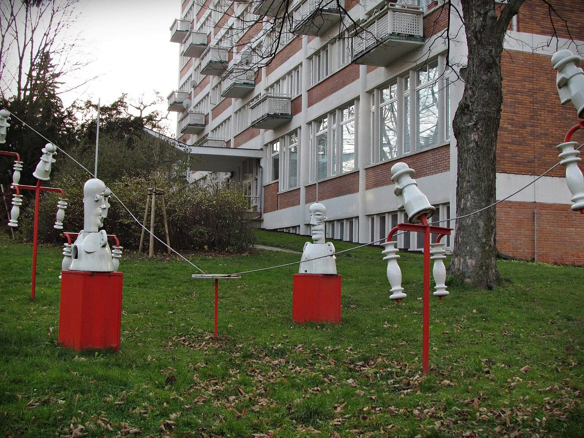 Je umístěno v parčíku před Kulturním centrem a Kolektivním domem na rohu ulice Štefánikovy a Budovatelů. Autorem je sochař Karel Nepraš (1932 - 2002). Tento český grafik, kreslíř, sochař a profesor pražské Akademie výtvarných umění nejprve vystudoval střední průmyslovou školu keramickou v Praze a poté absolvoval AVU v sochařském ateliéru profesora Jana Laudy. Kromě kreslení se v padesátých a šedesátých letech zabýval stylizovanými keramickými figurami zvířat. Od poloviny devadesátých let své sochy tvořil z drátů, trubek a nalezených kovových předmětů. Pracoval ale také s elektromateriálem, který využil při realizaci keramického díla Dialog VIII – hromosvod, určeného pro výstavu „Prostor Zlín“ roku 1994. Jedná se o železnou konstrukci, na níž jsou umístěny porcelánové prvky a tohle vše napodobuje elekrické vedení. V tomto duchu jsou vytvořeny i hlavy postav stojících proti sobě, vedoucí spolu jakýsi telepatický dialog ve formě neviditelného proudu elektrické energie.