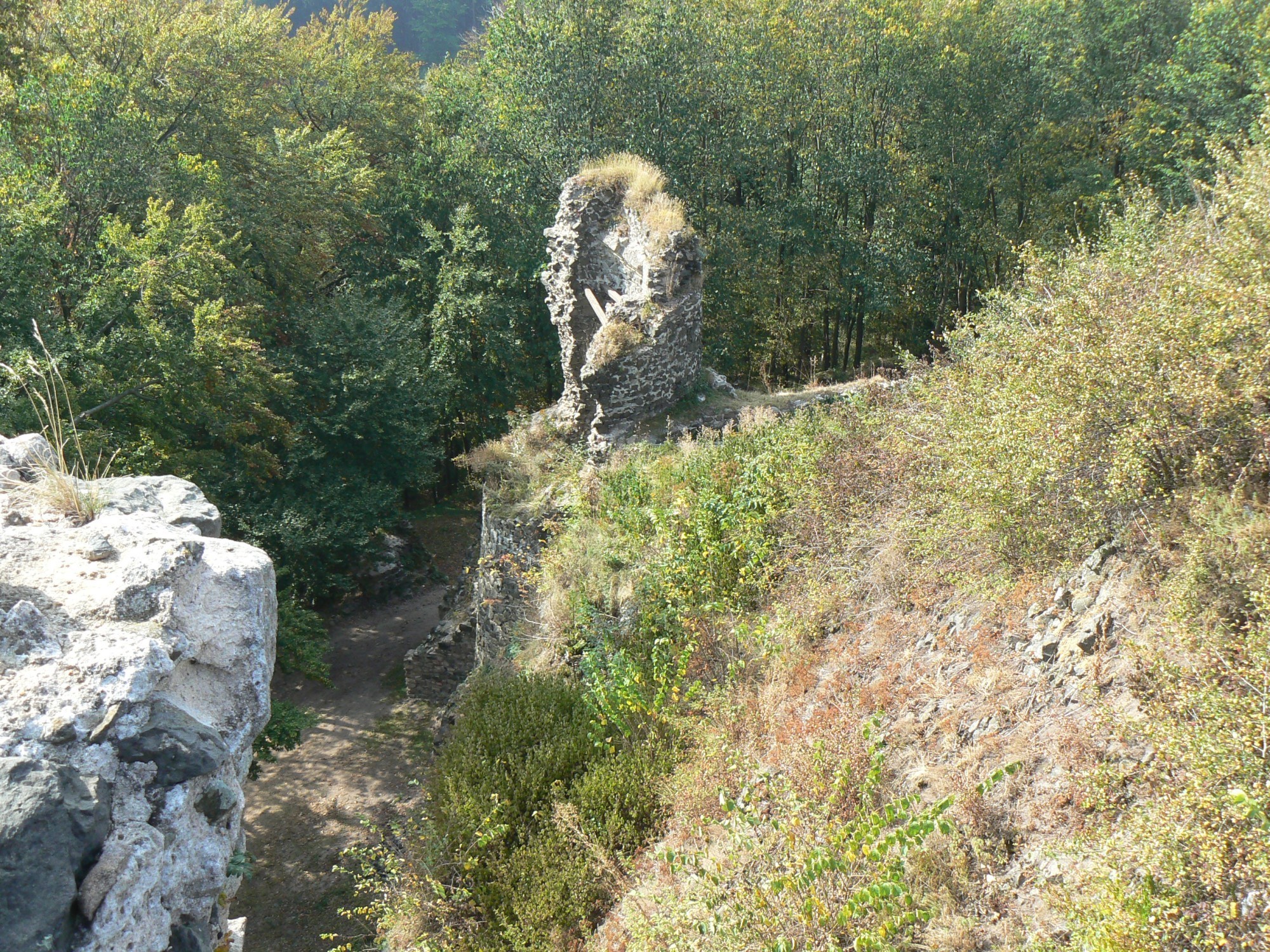 Na vlastní zřícenině nás čeká v příhodném počasí nádherný výhled z dřevěné vyhlídky nebo několika hradních zdí (pozor, žádné zábradlí), historie hradu na desce za první vstupní bránou, sklepení a stánek, kde lze zakoupit TZ a něco na osvěžení (stánek je otevřen pouze někdy a já jsem letos neměl štěstí ani při třech návštěvách - pokud také nebudete mít štěstí měli by TZ mít v Lomnici nebo v informačním centru na rozhledně Tábor). Pod hradními zdmi čekají dřevěné lavičky lákající k posezení.
