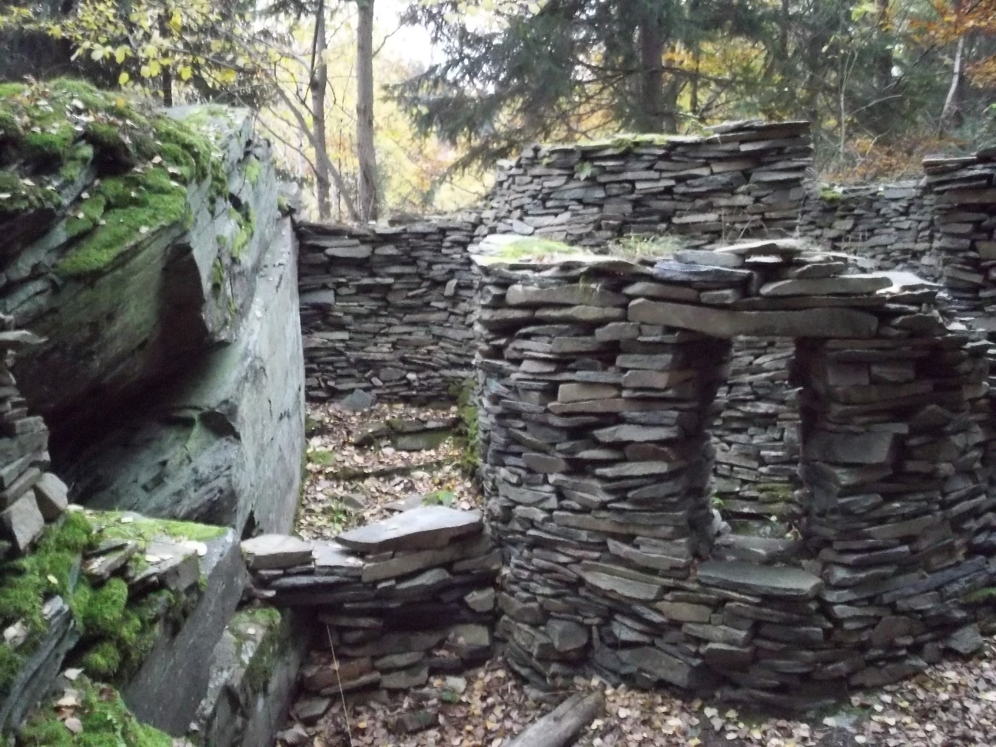 Přece jen jsme narazili na několik zdí, které vypadaly jako zbytky hradu. Docela nás však překvapilo, když jsme se dozvěděli, že nemají s původním hradem nic společného. Původní hradební zdi byly nějakými nadšenci rozebrány a postaveny z nich zcela nové zídky, které však původně v hradu vůbec nebyly. Z původní dispozice se zachovaly jen velmi nenápadné krátké úseky hradby.