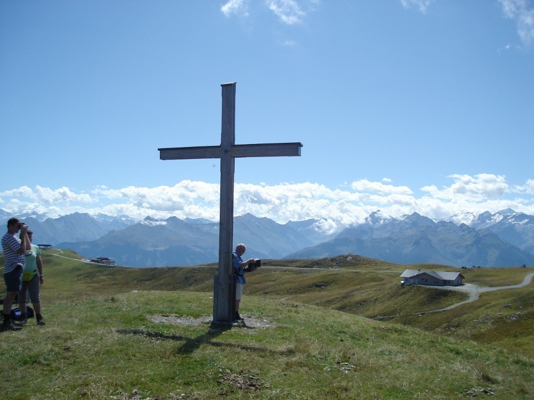 Dřevěný kříž na vrcholu. Špička za křížem je Rossgruberkogel (2.156 m n.m.)  autor: dupis