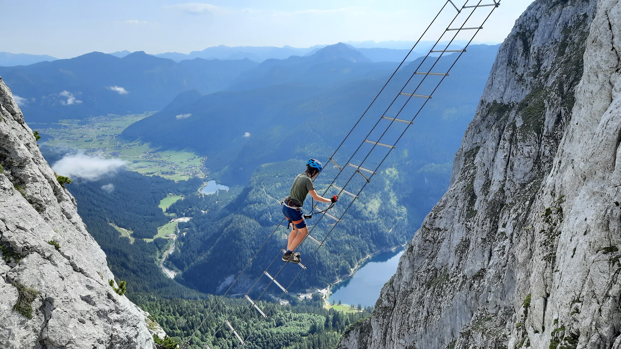 Dle předpovědi naplánujeme zlatý hřeb, konečně ten pravý zápřah. S hochem budíček v 5:45, donekonečna vysvětluji logistickou nutnost- kvůli zástupům, a vývoji počasí. Nakonec kapituluje...Vymyšleno dokonale, úderná část nastoupápěšky v 6, zbytek na pohodu v 8 lanovkou, část ferátou, část normálkou a obejmeme se v 10 u vrcholového kříže na Donnerkogelu(2050m) No člověk míní...Ale je krásně, zvedá se mlha, u chaty jsme skoro sami, kravičky, volná hora...První zádrhel - Lower part is closed, but higher is open... následujte šipky. Najdeme první dvě...S dalším českým párem hledáme onen alternativní nástup, ale stále více tápeme, že postupujeme normálkou, což nechceme. První slepá cesta, tudy ne...odpojíme se...Hoch zahlédne kýžený žebřík, jsou tam lidi, tak to nějak musí jít. Tak alespoň nástup k němu dohledáme. No opravdu veelmi vzdušný...Tak napětí opadá, budíž Rakušákům odpuštěno, že nás ochudili o první část. Kolem jen slovanská řeč, naštěstí žádné zástupy. Česká dvojka nás pouští, ofotí a pak oblaží exluzivními snímky. Hoch zdatně zvládá C/D úseky...