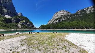 Druzi dorazí večer, vymyslíme pohodový výlet na horní, reps. zadní jezero (Hinterer Gosausee). Nechvátáme, čímž ale kolem 11 hod již dost plné parkoviště. Doplahočíme se k úchvatným views, kýčovité scenérie, kravky, hospůdka, pak i osvěžující koupel. Blaho...Tak proč jít zpět stejnou dálnicí, vezmeme to přes sedlo a pak je na mapě jakási čárkovaná trasa. To najdeme...Úskalí 500 m převýšení, dávnější polomy přehrazují cestu, zakrývají značky, tak slabší dvojička otáčí. Zbytek srdnatě nastoupá, další palec nahoru pro dcérku. Odbočku na neznačnou taktéž najdem. Cestička jakási je, občas mužík. To půjde...do prvního zabloudění...To morálka pozvolna klesá i u jinak optimistického druha.Napětí opadne až nástupem na lesní cestu...No cesta byla delší o to náročnější a zajímavější...tak ještě otestujeme teplotu vody v jezeře předním (Vorderer Gosausee) a den druhý úspěšně za námi...