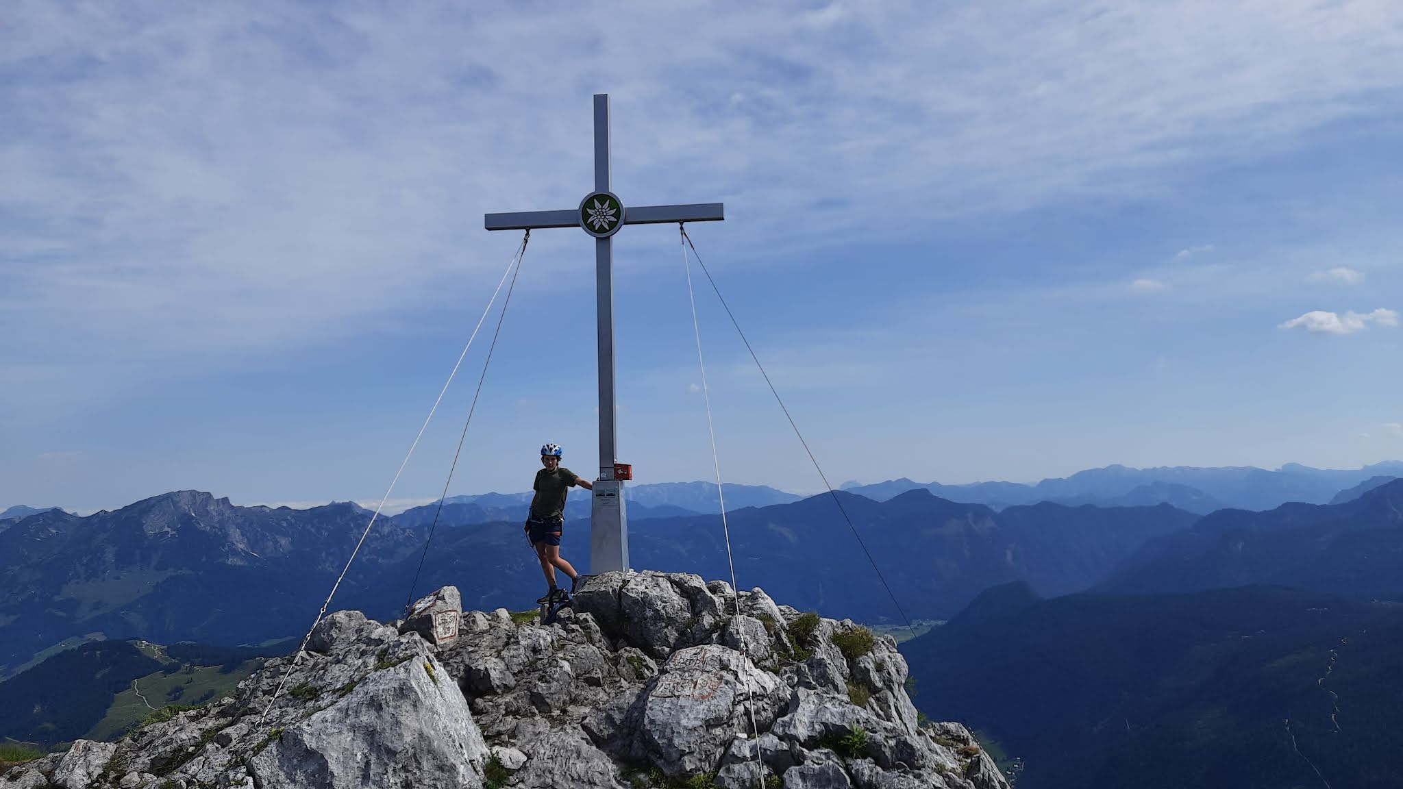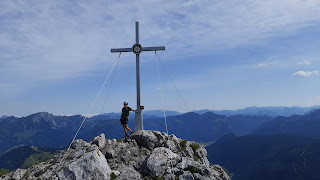 Zádrhel druhý. Přichází zpráva od druhé části :my ten vrchol nedáme, ušli jsme kousek a vyhodnotili jej za nebezpečný neb to po nočním dešti trochu klouže...Dobrá, běžte traverzem na pohodu, za 1,5 hod je chata, tam se potkáme. V 10 hod jsme na vrcholku. Naprostá paráda! Výhledy Dachstein, Hochkönig, družba s českou dvojkou, dorazí normálkou i zklamaný páreček, který ještě nasměrujeme k druhému pokusu. A pustíme se na sestup, samozřejmě horší trasou...nur für geubte...Opravdu. Horem, dolem. A zádrhel č.3- přichází zpráva - ženě se traverz nelíbil, vyhodnotila jej jako nebezpečný, tak se vracíme. ??! Tak si s hochem v poklidu strmě sejdem na Stuhlalm, krása, nádhera, obídek, spinatknödel, weizen...trochu se horší počasí, asi na 10 min mírný deštík, pak zas sluníčko ...a marně cestou zpět traverzem hledáme ono velmi nebezpečné místo. No každý to má nastavené jinak. Zkontrolujeme nástup ferátky, najdeme ztracenou šipku a skutečně prováděnou údržbu...pak trochu nahánění se se zbytkem. Potkávají se dvě zcela nekompatibilní emoce. Dobyvatelská a sestupová euforie s jakousi nenaplněnou podrážděnou dysforií...No co už...sestup, krávy, naražená prdélka a osvěžující koupačka. Nálady se aspoň trochu slaďují.