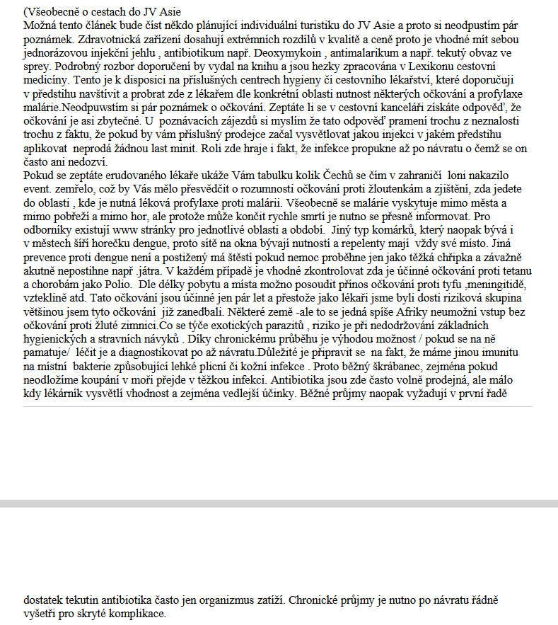 Zdravim a prohledávám svoje poznámky z cest a přednášek o Asii. Z doby moji působnosti jako praktický lékař v chudinské čtvrti v Manile. Nedokáži to odpovědně dat do tohoto editoru. Ale až někoho kousne vzteklý pes tak možná promine překlepy a bude mit jiné starosti.V fotopřilohách jsou ucelnějsí poznámky Dengue,Infekty, Hadi,Očkování...malárie..kokosove ořechy