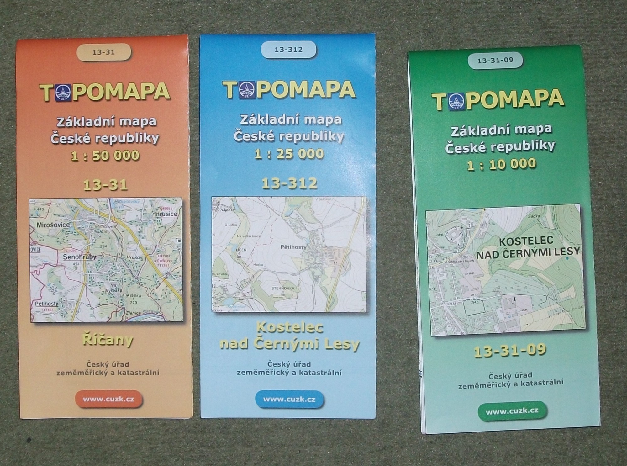 Mapy si totiž můžete zakoupit v mapových prodejnách Zeměměřického úřadu nejenom ve volných nesložených listech, ale také složené. Z oblasti, která vás zajímá, můžete mít několik map a každou dokonce v jiném měřítku. Měl jsem to jednoduché, neboť oslavenec bydlí v Kostelci nad Černými lesy a tak jsem vybral tři mapy různých měřítek.