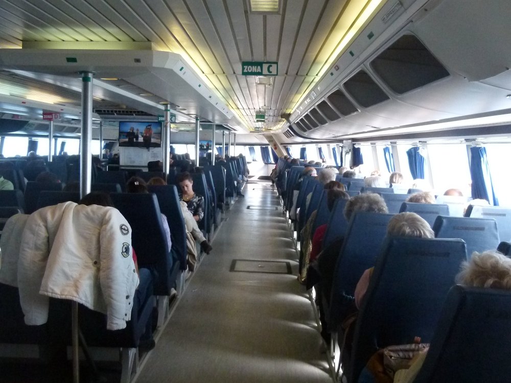 Některé spoje staví po cestě ještě na ostrově Procida. Dejte pozor abyste nevystoupili omylem už tam ! Poznáte to ale lehce. Procida je nízká a už z ní je vidět vzdálenější a vysoká Ischia s horou uprostřed.