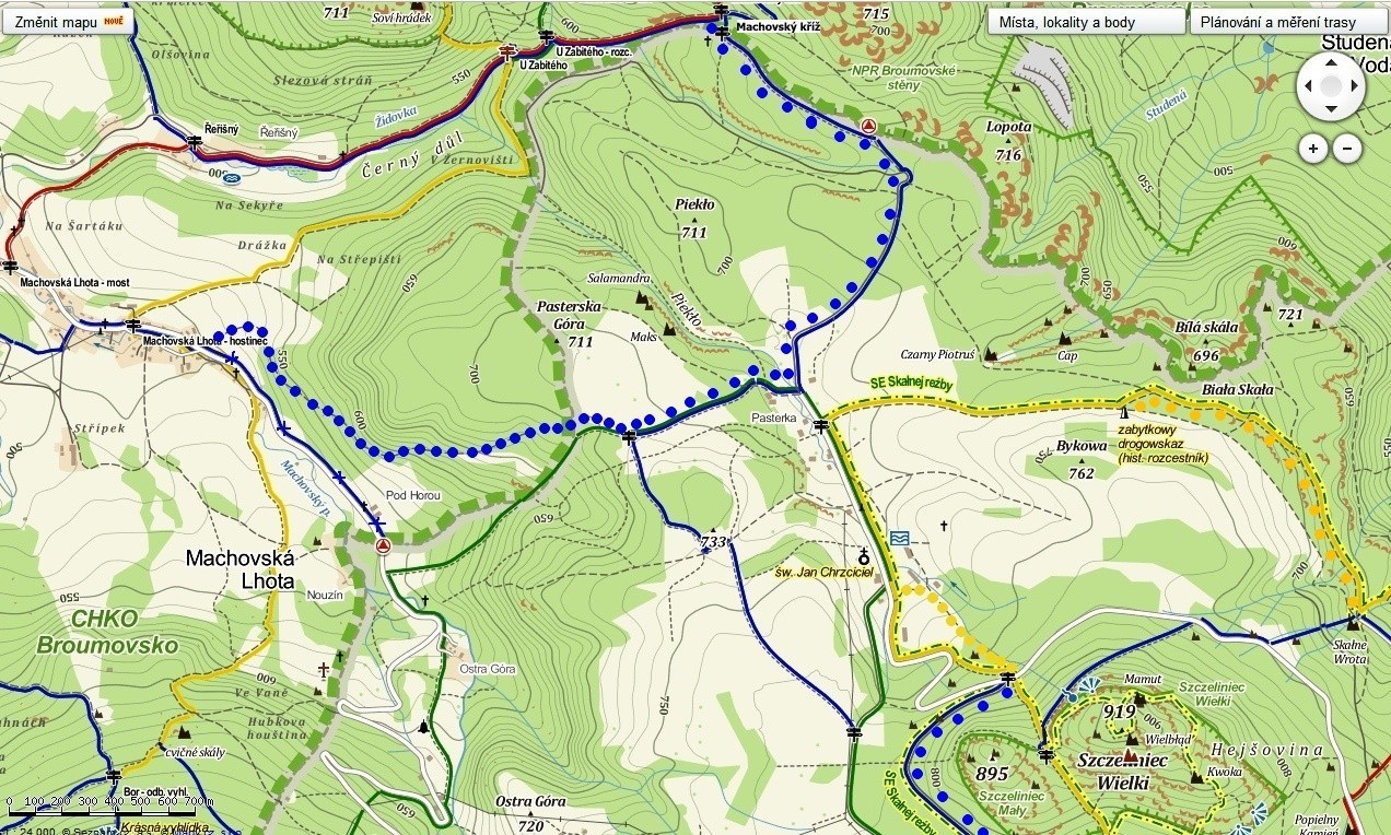 Od přátel jsem dostal echo, že „se nějak“ změnilo značení turistických tras mezi Machovem, polskou Pasterkou a Hejšovinou, pročež jsem se to vydal prozkoumat. Skutečně jsem dost změn zaregistroval. Dříve se do Pasterky (výchozí bod z „naší“ strany na Hejšovinu) chodilo po modré značce po silnici ke státní hranici a za ní se po pár desítkách metrech odbočilo na polskou zelenou značku. To bylo ze značených cest vše. Dnes tato možnost sice zůstává, ale modrá značka je přemístěna na lesní cestu nad Machovskou Lhotou a vyúsťuje na rozcestí nad Pasterkou na polskou modrou značku, přicházející od Karlowa a společně se zelenou sestupují na dolní konec Pasterky. Druhou možností je jít z Machova po červené přes Řeřišný a rozcestí U zabitého k Machovskému kříži, kam je z Pasterky protažená výše uvedená modrá značka. Celou nově vedenou modrou značku jsem modrými tečkami vyznačil do screenshotu z mapy.cz a ten přikládám do galerie. Kromě těchto změn si na mapce povšimněte ještě drobné změny na polské žluté z Pasterky na Hejšovinu a oproti starším mapám je i jinak vedená tatáž žlutá v úseku mezi historickým rozcestníkem a Skalními vraty. Na starších mapách nebudete mít ani modrou značku kolem Malé Hejšoviny. Podrobněji jsou tyto změny popsány v popisu trasy https://www.turistika.cz/trasy/vodopady-posny-a-hejsovina-z-machova-po-novych-znackach .