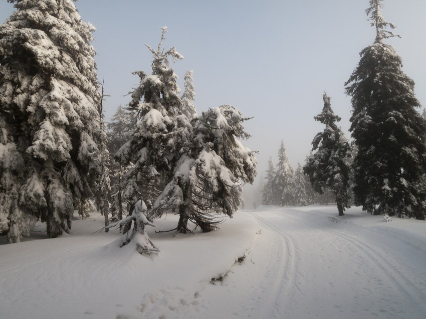 Ještě pro úplnost, z Petrovky jsme jeli 27.12.2011 a stopa byla udělaná. Mimo to počasí inverze, na sedle hnusně, cestou jakbysmet, vylezli jsmne na Švýcárnu, vykukovalo sluníčko, v hospodě se vyjasnilo, před Švýcárnou jak na jaře, ale z mraků lezly jen nejvyšší vrcholky a pak dolů zase mlha a mrholení...