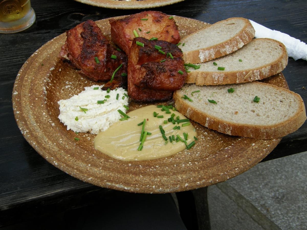 Ovšem nejen historií a kulturou živ je člověk a tak určitě není od věci zajít za občerstvením do některé z hospod umístěných v „dřevěném“ městečku, ze kterých na Vás dýchne nejen historie valašského kraje, ale i vůně zdejších pochoutek. Svou vůní už zdaleka láká jedna ze zdejších pochoutek, kterou místní připravují dvěma způsoby. Základem je pokaždé uzený bůček. V prvním případě jej ve zdejší kuchyni povaří a pak řádně osušený potřou česnekem a obalí v pepři a kmínu, podle chuti i rozdrceném jalovci nebo zelených bylinkách a upečou spolu s nakrájenou petrželí, cibulí a mrkví. Podle dalšího receptu se uzené maso rovněž povaří, ale až poté, když celou oloupanou cibuli, hřebíček, bobkový list a černý pepř přivedeme k varu a necháme 10 minut povařit. Maso následně necháme ve vývaru po dobu 20 minut pouze prohřát a z malého množství vývaru si za spolu s medem a worchestrem připravíme směs na potírání. Maso pak pečeme při 160 stupních přibližně 40 minut. Výsledný produkt chutná skvěle s křenovou omáčkou, ale i gurmány uspokojí s čerstvým pečivem, nakládanými cibulkami a kyselými okurkami (pochopitelně hořčice a křen nemůže chybět).