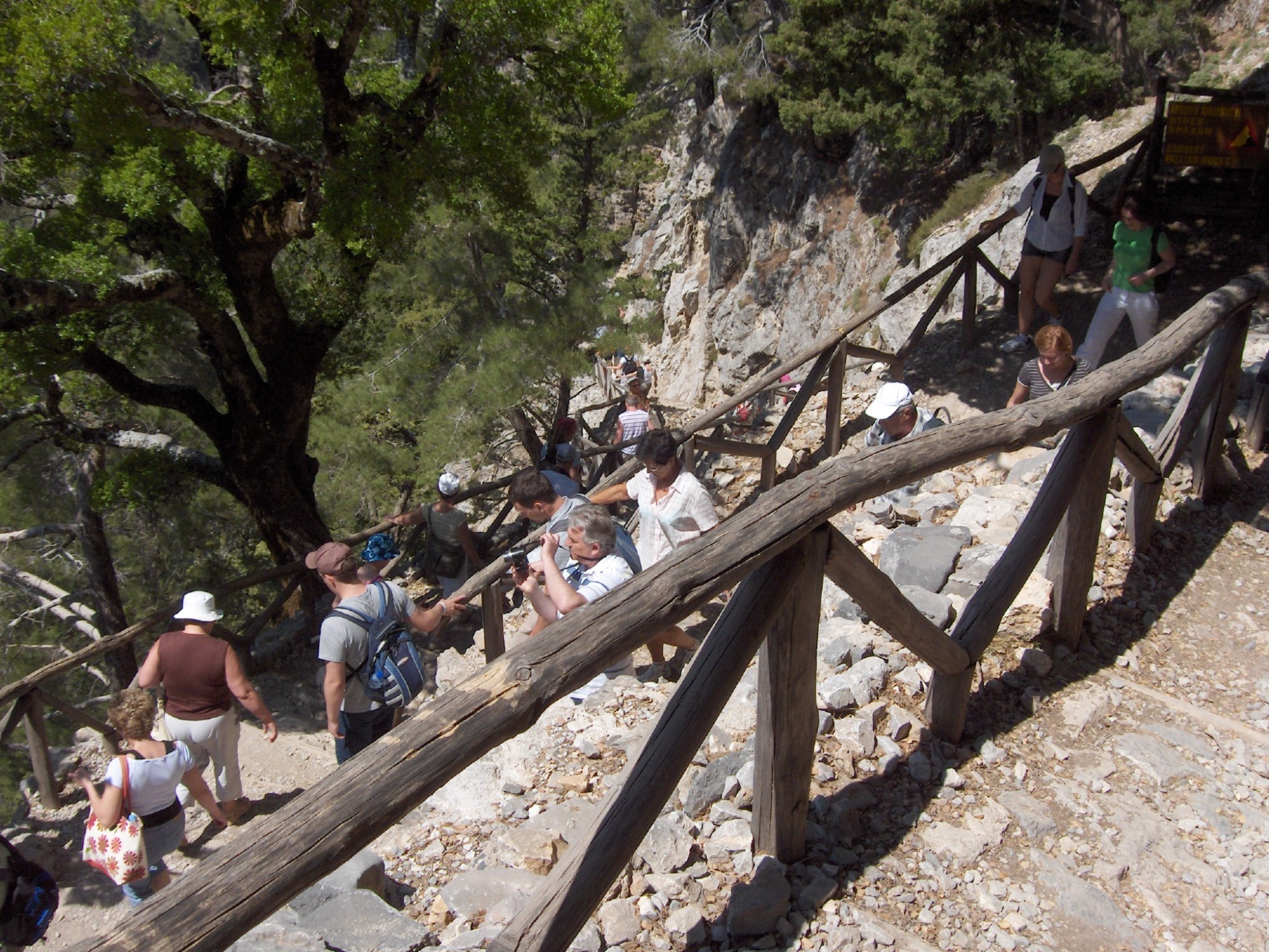 Na místě jsem si u delegátky CK zaplatil tento výlet. Mohl jsem si vybrat buď německého nebo polského průvodce. Od hotelu se odjíždělo v 7 hodin. S delšími taktickými zastávkami na občerstvení u benzínové pumpy a pak u místní hospůdky jsme až po 11 hodině dojeli ke vstupu do soutěsky Xyloskala /dřevěné schodiště/ ve výšce 1227 m. Ještě v autobuse jsme dostali malou mapku, kde byly uvedeny průchozí časy, které je nutné dodržet, aby se stihlo odplutí lodi v 17 hodin. Na první pohled to bylo jednoduché, ale skutečnost byla pak jiná. Počáteční sestup je velice náročný. Strmě se sestupuje po uhlazených kamenech a kořenech stromů. Protože se zde sjíždí hodně autobusů, je na cestě plno výletníků a postup je dost pomalý. Schází se do soutěsky, kde cesta vede většinou vyschlým kamenitým korytem říčky nebo v její blízkosti. Je potřeba stále se koukat pod nohy a v tom labyrintu kamení hledat schůdnou cestu. K tomu se přidává stále větší vedro. Průchozí časy neumožňují nějaké delší kochání se okolní krásou, ale nutí stále pospíchat dál. Díky krátkým zastávkám na fotografování jsem stále nestíhal. Sestupem soutěskou se zvyšuje vedro, není před ním úniku. Výhodou je dobrá dostupnost pitné vody. Ke konci soutěsky jsem potkával plno utrmácených, ploužících se a posedávajících výletníků, rodičů nesoucí své menší děti. Bylo vidět, že většina nevěděla co je čeká a dali na své zástupce CK, že je to jednoduchý výlet. Nebyli připraveni a vybaveni na tuto túru.