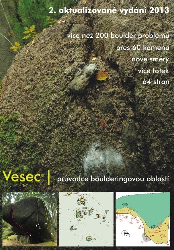 Průvodce boulderingovou oblastí Vesec II.aktualizované vydání 2013 je kvalitou a a zpracováním srovnatelný, ne-li lepší než kdejaký zahraniční průvodce na boulderingové oblasti. Celý průvodce má 63 stran, je plnobarevný s velice kvalitním a odolným papírem pro hrubé zacházení ve skalách. Orientace v něm je velice snadná a určitě najdete kámen, který hledáte. Je zde celková mapa oblasti a jednotlivých sektorů, fotky jednotlivých kamenů s půdorysy i fotky z přelezů. V zadní části je i místo na vaše poznámky nebo zápisky.