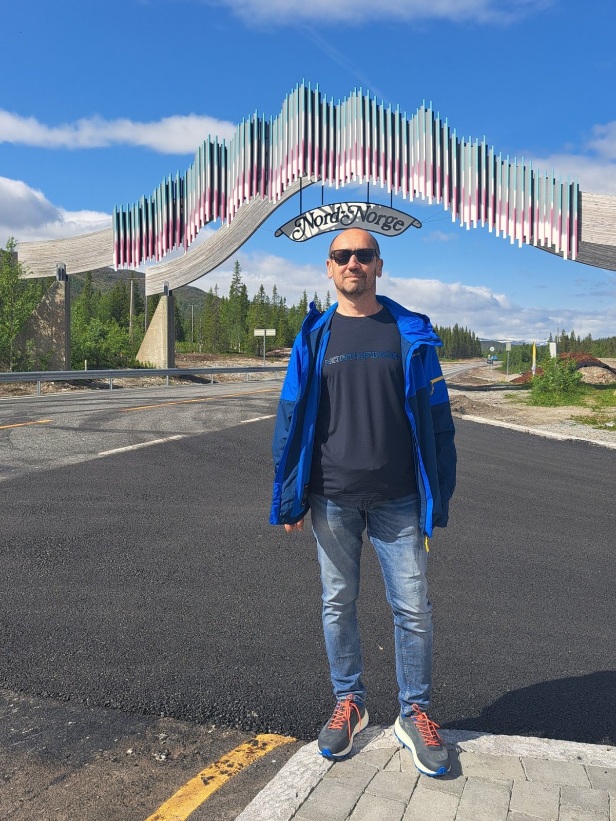 Kousek za městečkem Namsskogan překračujeme slavnostně 65. rovnoběžku. Další významný milník v naší cestě na sever. Toto oblečení je přímo učené pro 65. rovnoběžku  autor: Bubinga