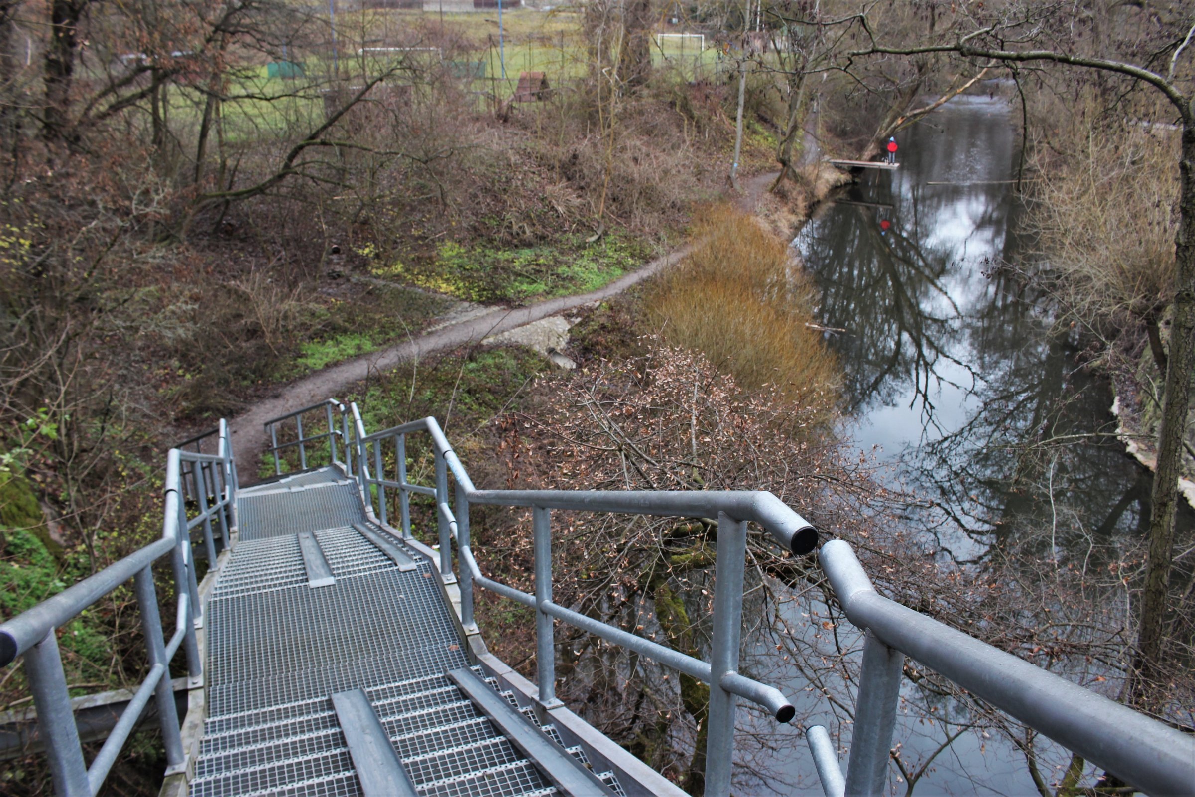 Po kovovém schodišti překonává trasa osm metrů vysokou skálu nad řekou