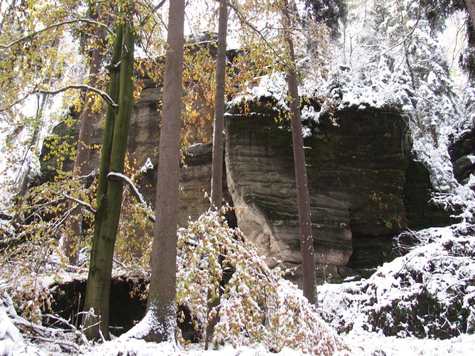 Trasa nám začíná na malém parkovišti blízko mlýnu. V občerstvení je třeba zaplatit 2,5 eur za celodenní parkování a už se můžeme vydat na cestu. První úsek nás vede podél rybníka do lesa a dál do kopce. Stoupání sice není příjemné, ale cesta je lemována pískovcovými skalkami. A hlavně po nastoupaných metrech se jde příjemně po vrstevnici. Nezapomene udělat velice příjemnou odbočku vlevo na Saskou vyhlídku. Samostatně stojící pískovcová skalka, na kterou vedou bezpečné železné žebříky, nám poskytuje krásný výhled na protější stráně s vyčnívajícími skalami a altánem. Po vrácení se zpět na cestu, pokračujeme ještě dál po vrstevnici přes další vyhlídku Johaniswacht dolů do údolí, kde překročíme silnici a už opět vzhůru. Procházíme skalním bludištěm k Herkulovi. Cesta pokračuje po vrstevnici, klikatí se, abychom při prvním spatření Wilhemínina altánu patřičně žasli. Wilhemínin altán zde nechal postavit r. 1880 architekt J.G.Kaiser z Rosenthalu. Byla to vlastně hospodská sázka. Příjemná cesta pokračuje až k sestupu zpět u mlýna. My se však ještě k autu nevracíme, přejdeme silnici a opět stoupáme za dalšími „divy“. Po nastoupání nějaký pár metrů se dostáváme k Růžové zahradě, místo jež patřilo mezi oblíbené výletní místo již v 19. stol., kdy sem přicházeli lázeňští hosté. Je zde dobrá akustika, pořádala se zde hudební vystoupení. O kousek dál je ve skalní míse Pamětní háj. Tiché vzpomínkové místo padlým ve francouzsko-německé válce (1870-1871). Po krátkém spočinutí na celkem magickém místě, pokračujeme dál přes několik vyhlídek, nabízející pohled do údolí na Švýcarský mlýn, sestoupíme na silnici a vracíme se k autu.